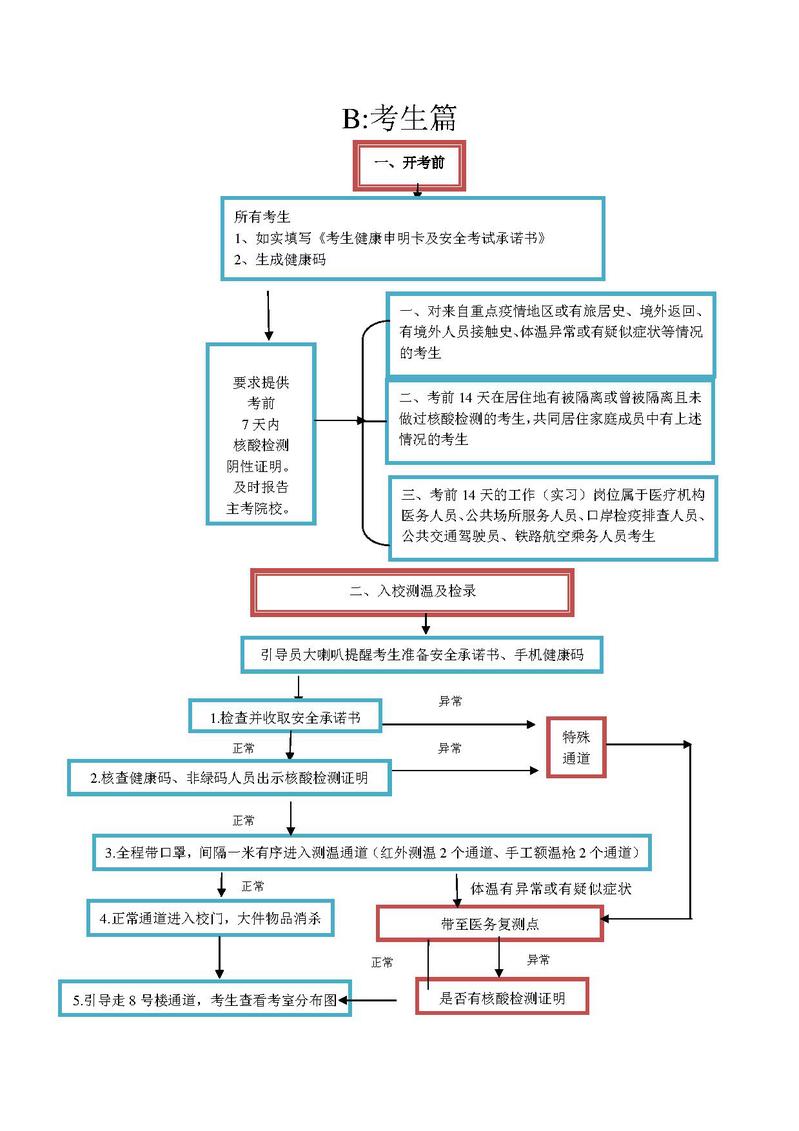 1.來自重點(diǎn)疫情地區(qū)或有旅居史、境外返回、境外人員接觸史、體溫異常或有疑似癥狀等情況,考前14天曾被隔離或曾被隔離未做過核酸檢測、共同居住家庭成員有上述情況的考生,考前14天的工作(實(shí)習(xí))崗位屬于醫(yī)療機(jī)構(gòu)醫(yī)務(wù)人員、公共場所服務(wù)人員、口岸檢疫排查人員、公共交通駕駛員或鐵路航空乘務(wù)人員的考生,上述考生須提供考前7天內(nèi)核酸檢測陰性證明后方可進(jìn)入學(xué)校,無提供核酸證明者不得進(jìn)入校園!