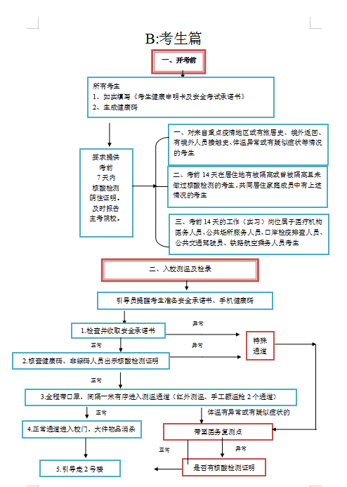 2.來自重點疫情地區(qū)或有旅居史、境外返回、境外人員接觸史、體溫異?;蛴幸伤瓢Y狀等情況,考前14天曾被隔離或曾被隔離未做過核酸檢測、共同居住家庭成員有上述情況的考生,考前14天的工作(實習)崗位屬于醫(yī)療機構(gòu)醫(yī)務(wù)人員、公共場所服務(wù)人員、口岸檢疫排查人員、公共交通駕駛員或鐵路航空乘務(wù)人員的考生,上述考生須提供考前7天內(nèi)核酸檢測陰性證明后方可進入學校,無提供核酸證明者不得進入校園!