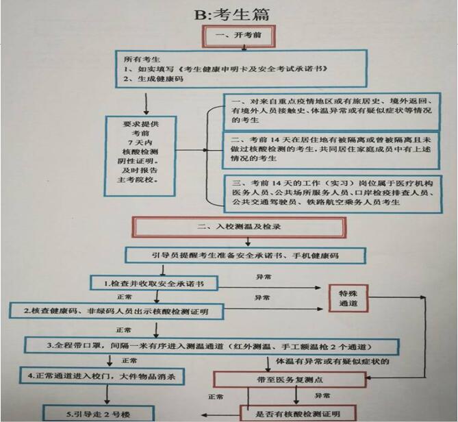 2.來自重點疫情地區(qū)或有旅居史、境外返回、境外人員接觸史、體溫異?;蛴幸伤瓢Y狀等情況,考前14天曾被隔離或曾被隔離未做過核酸檢測、共同居住家庭成員有上述情況的考生,考前14天的工作(實習)崗位屬于醫(yī)療機構(gòu)醫(yī)務人員、公共場所服務人員、口岸檢疫排查人員、公共交通駕駛員或鐵路航空乘務人員的考生,上述考生須提供考前7天內(nèi)核酸檢測陰性證明后方可進入學校,無提供核酸證明者不得進入校園!