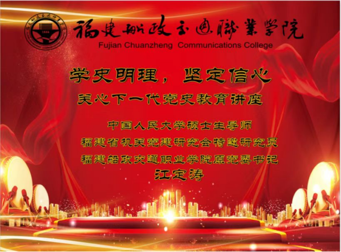 以史為鑒,開(kāi)創(chuàng)未來(lái)。為推動(dòng)黨史學(xué)習(xí)教育常態(tài)化長(zhǎng)效化開(kāi)展,以實(shí)際行動(dòng)迎接黨的二十大勝利召開(kāi),2022年5月31日下午,學(xué)院關(guān)工委邀請(qǐng)“五老”代表、中國(guó)人民大學(xué)碩士生導(dǎo)師、福建省機(jī)關(guān)黨建研究會(huì)特邀研究員、福建船政交通職業(yè)學(xué)院原黨委書記江定濤做《學(xué)史明理 堅(jiān)定信心》黨史學(xué)習(xí)教育專題講座。馬克思主義學(xué)院教師代表、習(xí)近平新時(shí)代中國(guó)特色社會(huì)主義思想讀書社、船政青年求是社、辯論協(xié)會(huì)、法學(xué)社等師生百余人參加講座。