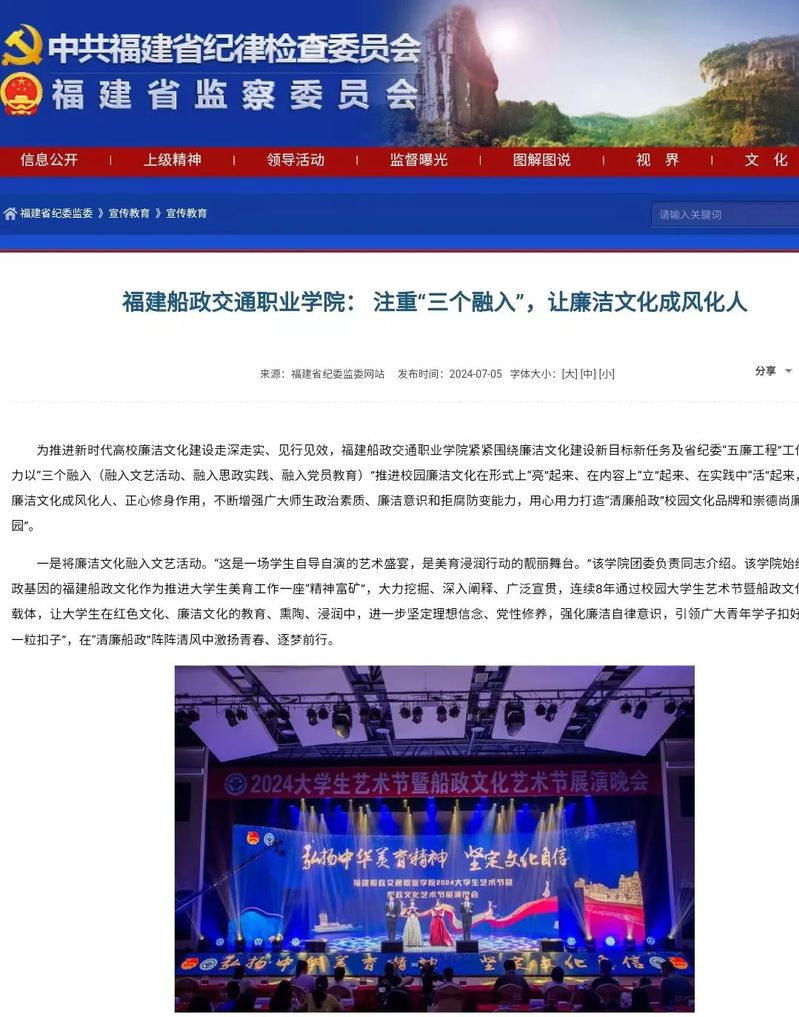 為推進新時代高校廉潔文化建設(shè)走深走實、見行見效,福建船政交通職業(yè)學院緊緊圍繞廉潔文化建設(shè)新目標新任務及省紀委“五廉工程”工作部署,著力以“三個融入(融入文藝活動、融入思政實踐、融入黨員教育)”推進校園廉潔文化在形式上“亮”起來、在內(nèi)容上“立”起來、在實踐中“活”起來,切實發(fā)揮廉潔文化成風化人、正心修身作用,不斷增強廣大師生政治素質(zhì)、廉潔意識和拒腐防變能力,用心用力打造“清廉船政”校園文化品牌和崇德尚廉的“清清校園”。