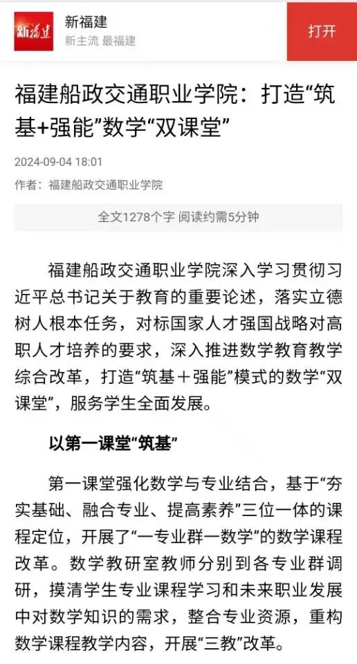 福建船政交通職業(yè)學(xué)院深入學(xué)習(xí)貫徹習(xí)近平總書記關(guān)于教育的重要論述,落實(shí)立德樹人根本任務(wù),對標(biāo)國家人才強(qiáng)國戰(zhàn)略對高職人才培養(yǎng)的要求,深入推進(jìn)數(shù)學(xué)教育教學(xué)綜合改革,打造“筑基+強(qiáng)能”模式的數(shù)學(xué)“雙課堂”,服務(wù)學(xué)生全面發(fā)展。