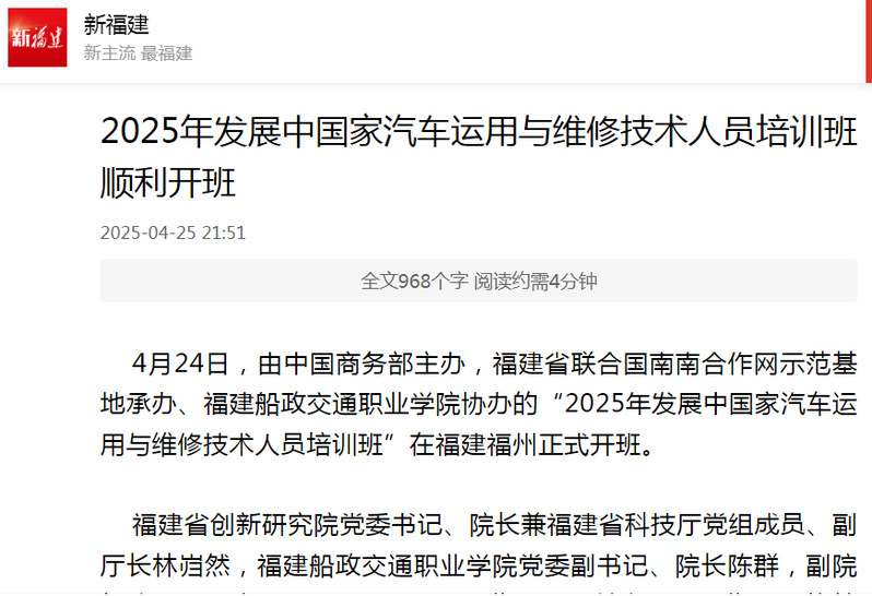 中新網(wǎng)福州4月25日電 4月24日,由中國商務(wù)部主辦、福建省聯(lián)合國南南合作網(wǎng)示范基地承辦、福建船政交通職業(yè)學(xué)院協(xié)辦的“2025年發(fā)展中國家汽車運用與維修技術(shù)人員培訓(xùn)班”在福建福州開班。 來自伊拉克、烏茲別克斯坦、尼泊爾、巴勒斯坦、格林納達、巴哈馬、巴西及巴拉圭等八個發(fā)展中國家的25名學(xué)員以及福建船政交通職業(yè)學(xué)院教師代表共同參加培訓(xùn)班的開班儀式。 此次培訓(xùn)班課程,深度融合了汽車運用與維修領(lǐng)域的理論精髓與前沿實操技能,旨在提高學(xué)員的專業(yè)技能和管理銷售水平,為來自發(fā)展中國家的學(xué)員們打造一個學(xué)習(xí)交流的平臺。 培訓(xùn)期間,學(xué)員們將前往寧德時代、寧德上汽和廈門金龍等企業(yè)參觀考察,與一線從業(yè)人員深入交流,近距離洞察汽車產(chǎn)業(yè)的最新技術(shù)趨勢與行業(yè)脈動,汲取國際領(lǐng)先的企業(yè)管理經(jīng)驗與創(chuàng)新實踐成果。 發(fā)展中國家汽車運用與維修技術(shù)培訓(xùn)班迄今已承辦2期,共來自13個發(fā)展中國家的54名學(xué)員參加教學(xué)培訓(xùn)。作為共建“一帶一路”教育行動的實踐案例,福建船政交通職業(yè)學(xué)院與中航國際合作,在肯尼亞、烏干達、科特迪瓦、加蓬等國家設(shè)立職業(yè)教育基地,提供師資培訓(xùn)和職業(yè)教育支持,培養(yǎng)當(dāng)?shù)芈殬I(yè)技術(shù)人才;聯(lián)合廈門金龍等本土企業(yè),創(chuàng)新實施“海外技師培養(yǎng)計劃”,在中東、非洲等地共建“海絲學(xué)院”,形成“技術(shù)培訓(xùn)-產(chǎn)業(yè)孵化-文化互鑒”的立體化合作矩陣。福建船政交通職業(yè)學(xué)院相關(guān)負(fù)責(zé)人表示,未來,該校將與各友好國家繼續(xù)堅持共商共建共享原則,加強互聯(lián)互通合作,合力講好船政交通人共建“一帶一路”故事,為全球職業(yè)教育共同體建設(shè)注入中國智慧和責(zé)任擔(dān)當(dāng)。(完)4月24日,由中國商務(wù)部主辦,福建省聯(lián)合國南南合作網(wǎng)示范基地承辦、福建船政交通職業(yè)學(xué)院協(xié)辦的“2025年發(fā)展中國家汽車運用與維修技術(shù)人員培訓(xùn)班”在福建福州正式開班。福建省創(chuàng)新研究院黨委書記、院長兼福建省科技廳黨組成員、副廳長林巋然,福建船政交通職業(yè)學(xué)院黨委副書記、院長陳群,副院長陳常暉與來自伊拉克、烏茲別克斯坦、尼泊爾、巴勒斯坦、格林納達、巴哈馬、巴西及巴拉圭等8個發(fā)展中國家的25名學(xué)員以及學(xué)院教師代表共同參加培訓(xùn)班的開班儀式。開班儀式由福建省聯(lián)合國南南合作網(wǎng)示范基地主任張華主持。
