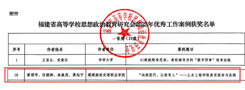 近日,福建省高等學(xué)校思想政治教育研究會(huì)公布了關(guān)于表彰2025年優(yōu)秀工作案例的通知。我院網(wǎng)絡(luò)育人工作案例《“向美而行,以美育人”——土木工程學(xué)院美育探索與實(shí)踐》獲評(píng)一等獎(jiǎng)。