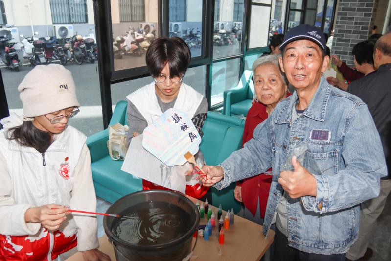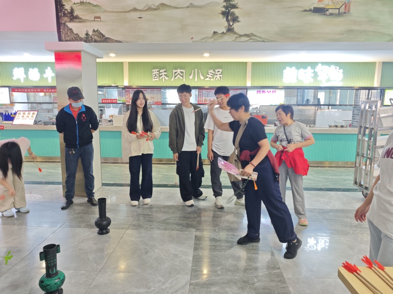 活動當(dāng)日,校園內(nèi)處處洋溢著溫馨氛圍,“歡樂重陽”趣味健身游園會將傳統(tǒng)民俗與趣味體驗巧妙融合,讓老同志們在互動中盡享歡樂。在制作漆扇區(qū),老師們手持素扇放入漆桶輕輕轉(zhuǎn)動,暈染出靈動紋路,讓樸素的扇面瞬間綻放出獨特光彩;干花香囊制作區(qū)里,老師們挑選心儀的干花與香料,親手縫制出一個個精致的香囊;投壺與捶丸項目前更是熱鬧非凡,老同志們或凝神瞄準(zhǔn)、穩(wěn)步投箭,或手持球桿、精準(zhǔn)擊球,現(xiàn)場時而響起歡呼喝彩,盡顯活力與風(fēng)采。隨后,學(xué)院組織離退休教師集體觀看電影,從影片中傳遞關(guān)懷。