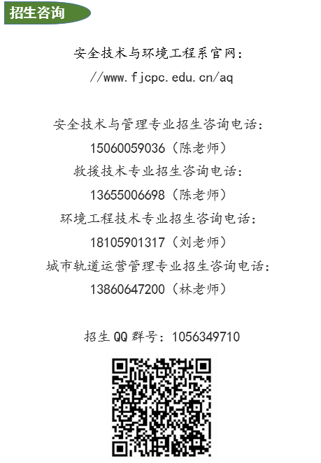 安全技術(shù)與環(huán)境工程系2020年擬開設(shè)安全技術(shù)與管理、環(huán)境工程技術(shù)、城市軌道交通運營與管理、救援技術(shù)四個專業(yè),其中安全技術(shù)與管理、環(huán)境工程技術(shù)是“中國特色高水平高職學(xué)校”重點建設(shè)專業(yè)群核心專業(yè)。