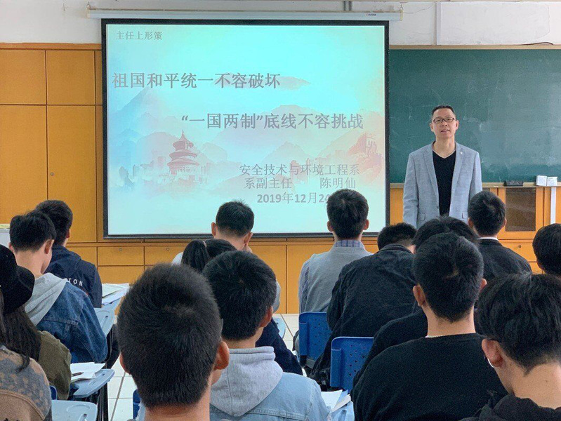 2019年12月24日下午,安全技術(shù)與環(huán)境工程系副主任陳明仙博士在科技樓801教室為安全技術(shù)與環(huán)境工程系各專業(yè)班級干部作了題為“祖國和平統(tǒng)一不容破壞、‘一國兩制’底線不容挑戰(zhàn)”的形式與政策報(bào)告。