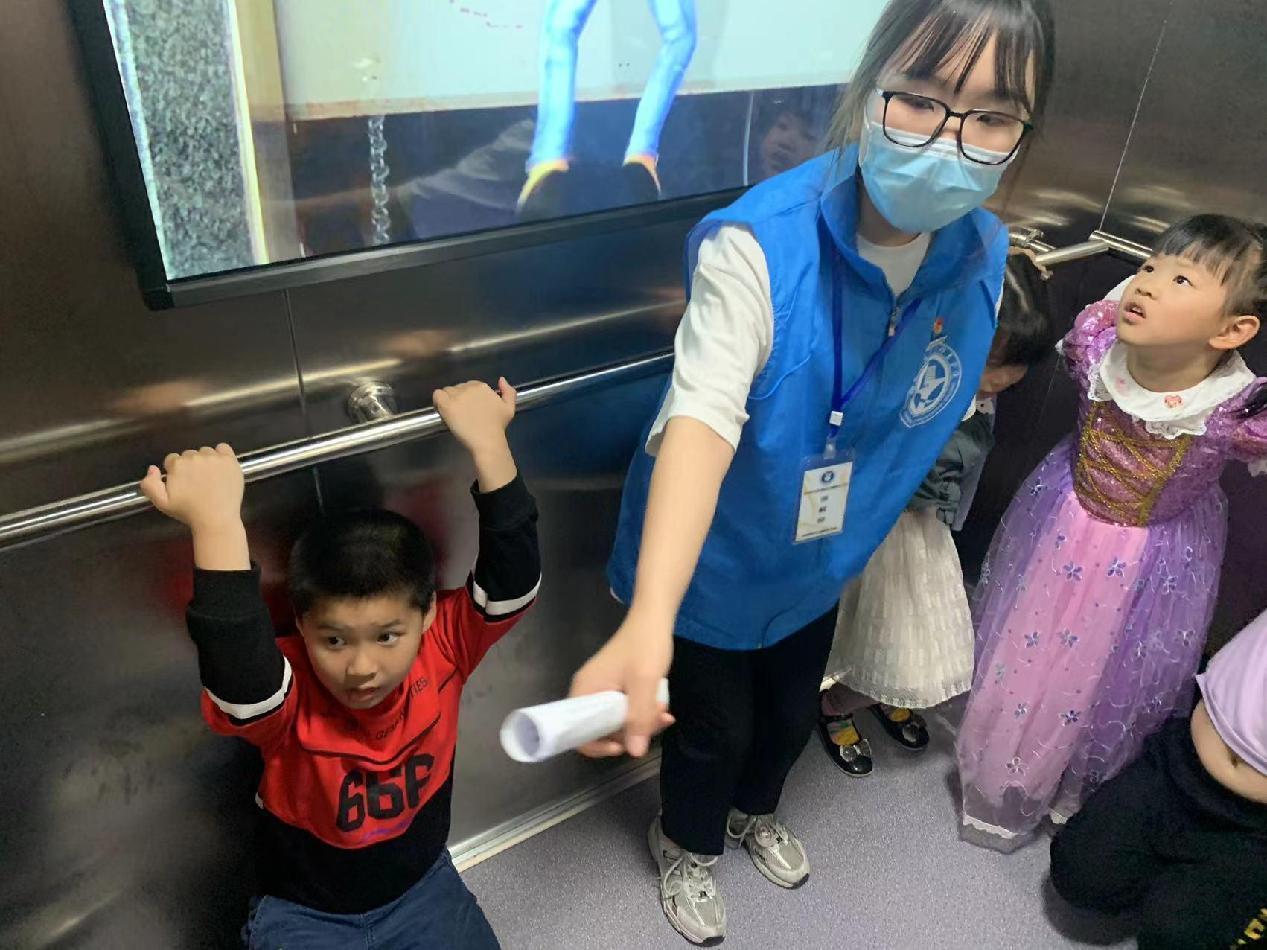 電梯墜落模擬中小朋友們按照志愿者的說(shuō)明擺好防護(hù)姿勢(shì)
