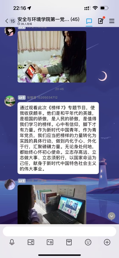 安全與環(huán)境學院第一黨支部主要以輔導員教師和學生為主,該支部組織教師黨員、學生黨員和入黨積極分子在創(chuàng)新樓201、202教室集中觀看,引發(fā)熱烈反響。觀看結束后,師生黨員通過線上、線下形式熱議,紛紛表達自己觀看《榜樣7》后的感想和觸動。