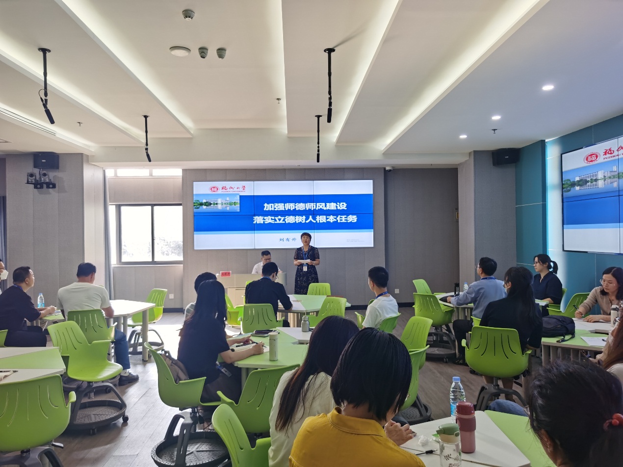 為深入學習貫徹習近平新時代中國特色社會主義思想和黨的二十大精神,進一步弘揚高尚師德風范,涵養(yǎng)潛心立德樹人的優(yōu)良師風,2023年9月27日,安全與環(huán)境學院全體教職工在藝新樓二樓公共產教融合基地宣教室舉辦師德師風專題講座,邀請福州大學馬克思主義學院副院長劉有升教授來校授課。此次講座由安全與環(huán)境學院黨總支書記鄭雪琴主持。