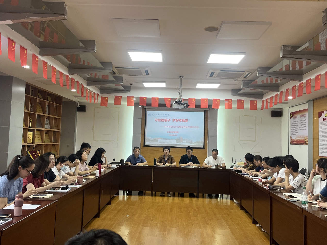 為了進(jìn)一步推動(dòng)常態(tài)化防范非法集資宣傳教育工作,切實(shí)提升安全與環(huán)境學(xué)院全體教職工對(duì)非法集資的防范能力和意識(shí),安全與環(huán)境學(xué)院于 2024年 6 月12日下午開(kāi)展了“守住錢(qián)袋子、護(hù)好幸福家”為主題的防范非法集資宣傳活動(dòng)。