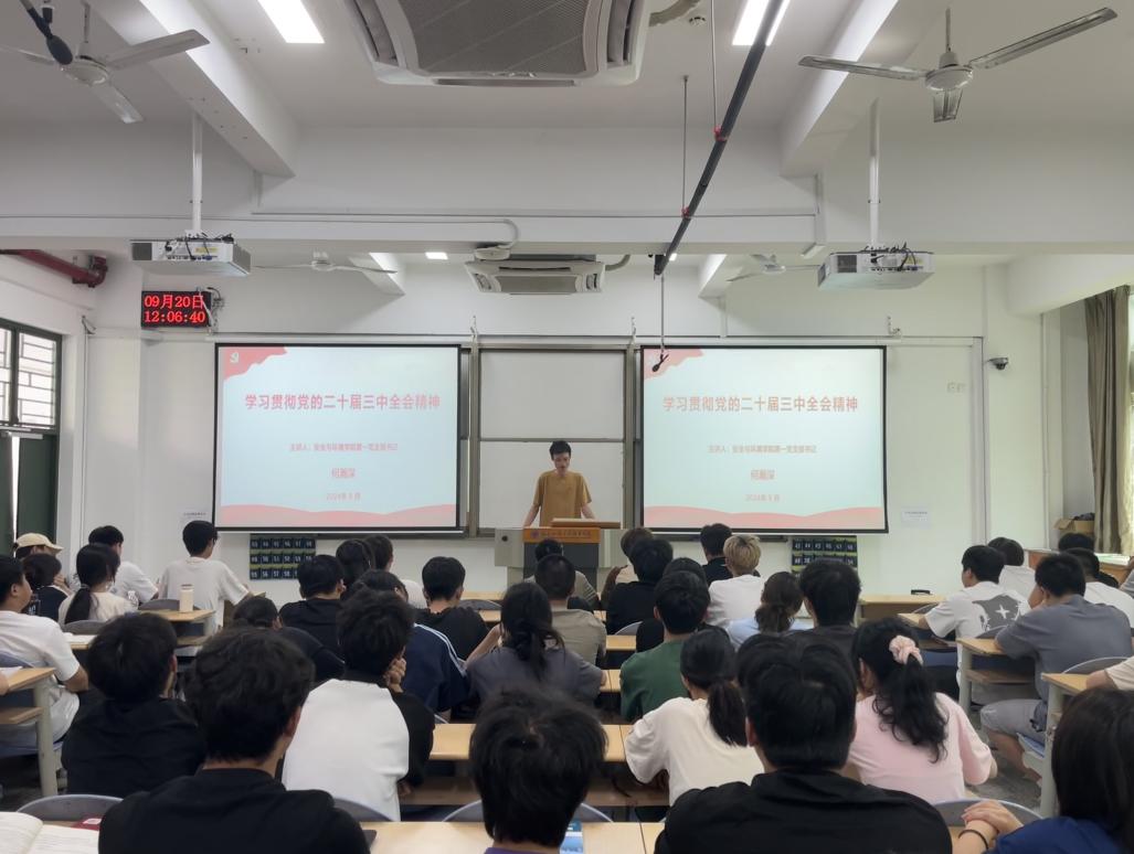 為了深入學(xué)習(xí)貫徹黨的二十屆三中全會精神,進(jìn)一步提高黨員和學(xué)生入黨積極分子的政治素養(yǎng)和理論水平,2024年9月18日,安全與環(huán)境學(xué)院第一黨支部在創(chuàng)新樓201教室,舉辦學(xué)習(xí)貫徹黨的二十屆三中全會精神主題宣講活動。宣講由黨支部書記何瀚深主講,第一黨支部黨員和學(xué)生入黨積極分子參加宣講。
