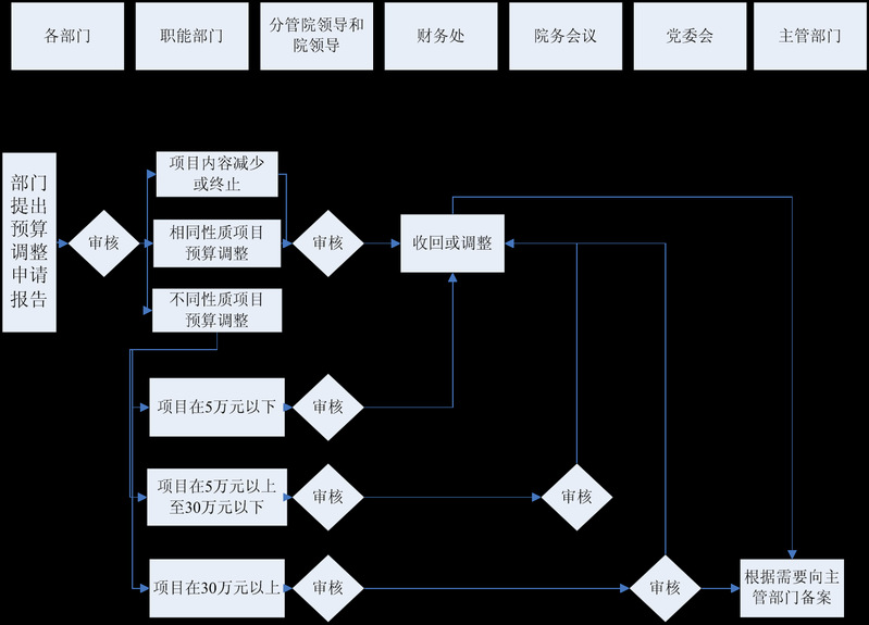 職能部門審核意見 → 分管院領(lǐng)導(dǎo)審批 → 院領(lǐng)導(dǎo)審批 → 院務(wù)會議審議 → 財務(wù)處根據(jù)指示調(diào)整。