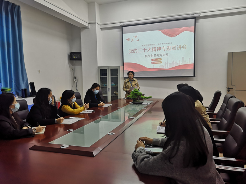 為深入學(xué)習(xí)宣傳貫徹黨的二十大精神,更好團(tuán)結(jié)引領(lǐng)廣大干部職工緊跟黨奮進(jìn)新征程,奪取新勝利,12月9日下午,機(jī)關(guān)財(cái)務(wù)處黨支部在行政樓一樓評(píng)標(biāo)室舉行“矢志不渝跟黨走,攜手奮進(jìn)新時(shí)代——學(xué)習(xí)貫徹黨的二十大精神宣講會(huì)”。黨支部書記龔玲帶領(lǐng)財(cái)務(wù)處全體干部職工齊聚一堂,共同學(xué)習(xí)領(lǐng)會(huì)黨的二十大精神。本次活動(dòng)采用“現(xiàn)場(chǎng)宣講”的形式進(jìn)行。