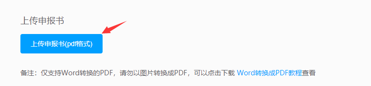 傳項(xiàng)目后,需要上傳項(xiàng)目申報(bào)書,點(diǎn)擊“上傳申報(bào)書(加蓋公章的pdf掃描件)”,(備注:僅支持Word轉(zhuǎn)換的PDF,請(qǐng)勿以圖片轉(zhuǎn)換成PDF,可以點(diǎn)擊下載 Word轉(zhuǎn)換成PDF教程查看),上傳項(xiàng)目申報(bào)書。