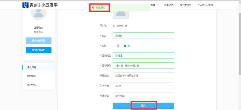 (4)點(diǎn)擊“提交”,跳出提示語“修改成功”
