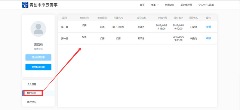 完成項(xiàng)目申報(bào)書上傳,完成項(xiàng)目創(chuàng)建,“提交”成功后,在“個(gè)人資料”——“我的項(xiàng)目”中可查看已上傳項(xiàng)目具體信息(屆別、賽事名稱、賽事級(jí)別、所屬機(jī)構(gòu)、項(xiàng)目名稱、上傳時(shí)間、報(bào)名截止時(shí)間以及項(xiàng)目狀態(tài))。