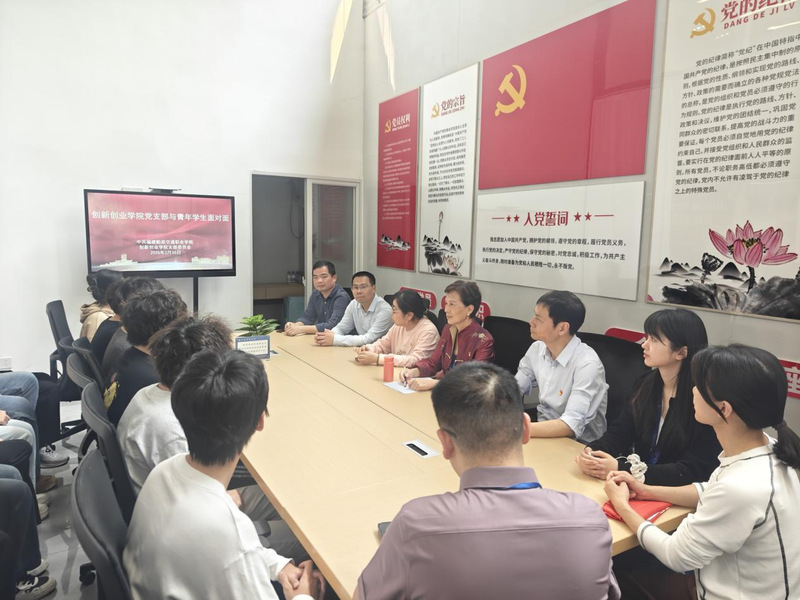 創(chuàng)新創(chuàng)業(yè)學(xué)院黨支部全體黨員與學(xué)生代表圍坐一起,圍繞我校開展的創(chuàng)新創(chuàng)業(yè)教學(xué)和實踐,創(chuàng)新創(chuàng)業(yè)項目培育和各類競賽等方面進(jìn)行深入交流。創(chuàng)新創(chuàng)業(yè)學(xué)院黨員認(rèn)真聽取學(xué)生代表提出的意見和建議,并詳細(xì)介紹了學(xué)校開展的“三階遞進(jìn)” 創(chuàng)新創(chuàng)業(yè)教育體系,交流過程黨員針對同學(xué)們關(guān)切的創(chuàng)新創(chuàng)業(yè)實踐和競賽獎勵等問題逐一進(jìn)行了解答。