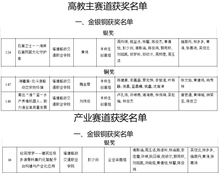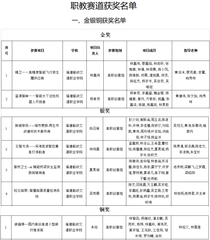 近日,根據(jù)“福建省教育廳關(guān)于公布福建省大學(xué)生創(chuàng)新大賽(2025)獲獎(jiǎng)名單的通知(閩教高〔2025〕20號(hào))”文件,我院在本屆大賽中榮獲2金6銀3銅的成績。其中,藍(lán)淵智眸——智能水下巡檢機(jī)器人開拓者和精衛(wèi)——高精度智能飛行救生圈供應(yīng)商兩個(gè)項(xiàng)目獲得福建省大學(xué)生創(chuàng)新大賽(2025)(職教賽道)金獎(jiǎng);砼筑綠夢(mèng)——建筑垃圾多源骨料集約化智配平臺(tái)構(gòu)建與產(chǎn)業(yè)化應(yīng)用項(xiàng)目獲得產(chǎn)業(yè)命題賽道銀獎(jiǎng);石厝衛(wèi)士——海岸石厝民居文化守護(hù)者項(xiàng)目獲得高教主賽道銀獎(jiǎng)。