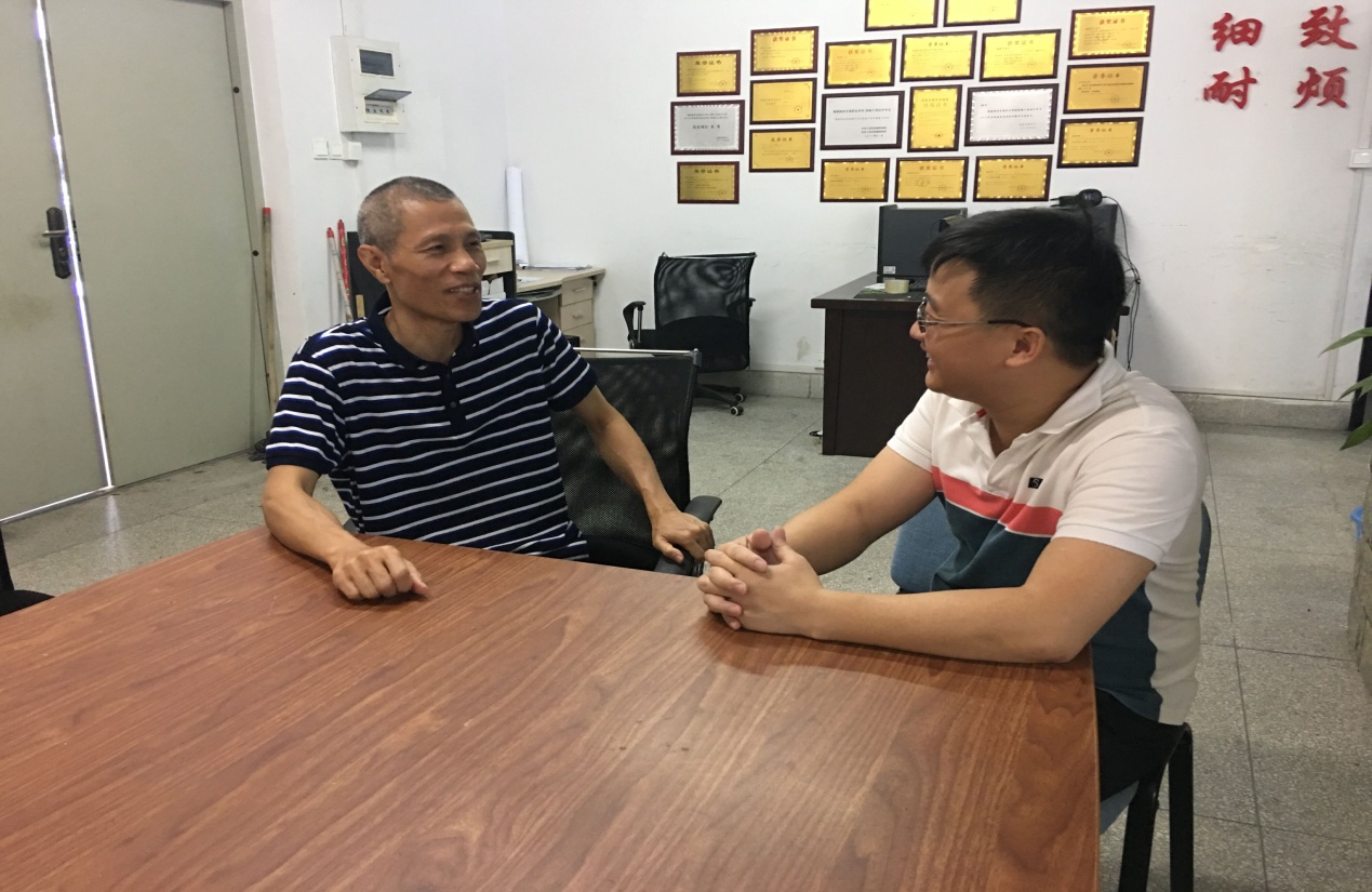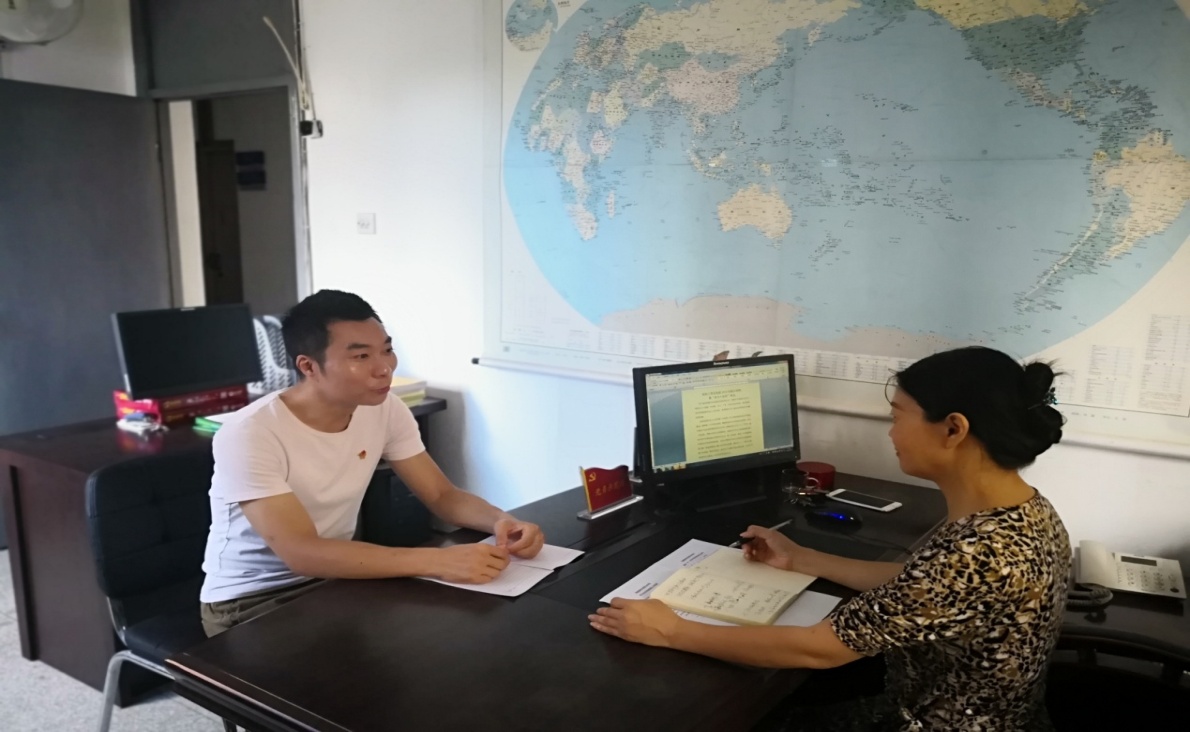 (圖為教工支部書記、實(shí)訓(xùn)中心主任鄭振杰與支部黨員實(shí)驗(yàn)員黃建偉同志談心談話場景)