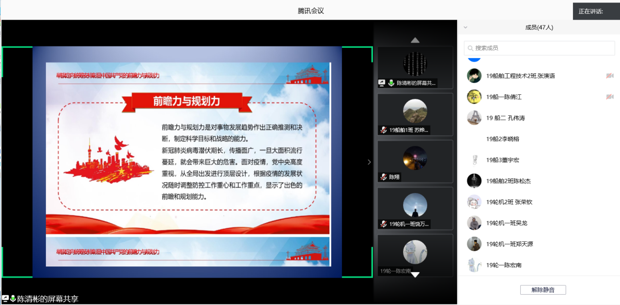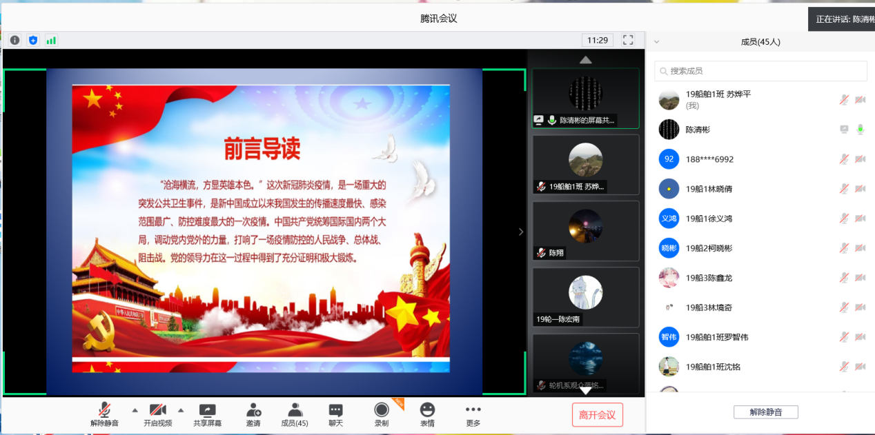 “滄海橫流,方顯英雄本色?!边@次新冠肺炎疫情,是一場重大的突發(fā)公共衛(wèi)生事件,是新中國成立以來我國發(fā)生的傳播速度最快、感染范圍最廣、防控難度最大的一次疫情,中國共產(chǎn)黨統(tǒng)籌國內(nèi)國際兩個大局,調(diào)動黨內(nèi)黨外的力量,打響了一場疫情防控的人民戰(zhàn)爭、總體戰(zhàn)、阻擊戰(zhàn)。為了響應(yīng)國家號召,2020年6月24日下午3點輪機工程系在騰訊會議上為19級入黨積極分子和班干部上了一堂形勢與政策課,由系主任陳清彬講授。