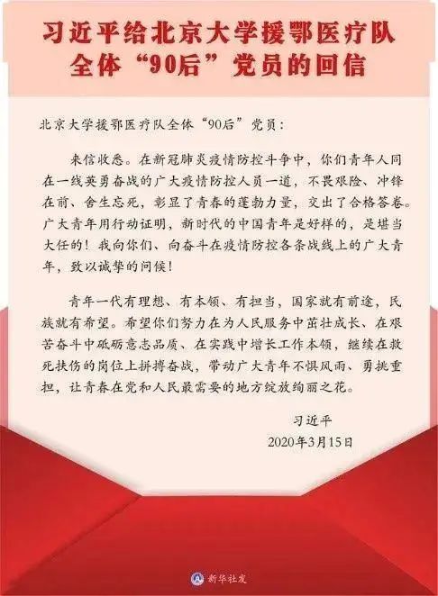 感謝總書記和黨中央對(duì)醫(yī)療隊(duì)員的關(guān)懷,大家一定認(rèn)真學(xué)習(xí)領(lǐng)悟回信精神,在前線發(fā)揮90后的全部能量,堅(jiān)定打好這場(chǎng)疫情防控阻擊戰(zhàn)。最重要的不是“幾零后”,而是“努力后”“奮斗后”,能夠到祖國(guó)最需要的地方去,能夠?yàn)閲?guó)家作貢獻(xiàn)、為人民服務(wù),才是實(shí)現(xiàn)人生價(jià)值的最好途徑。戰(zhàn)疫的關(guān)鍵時(shí)刻,一定站好最后一班崗。