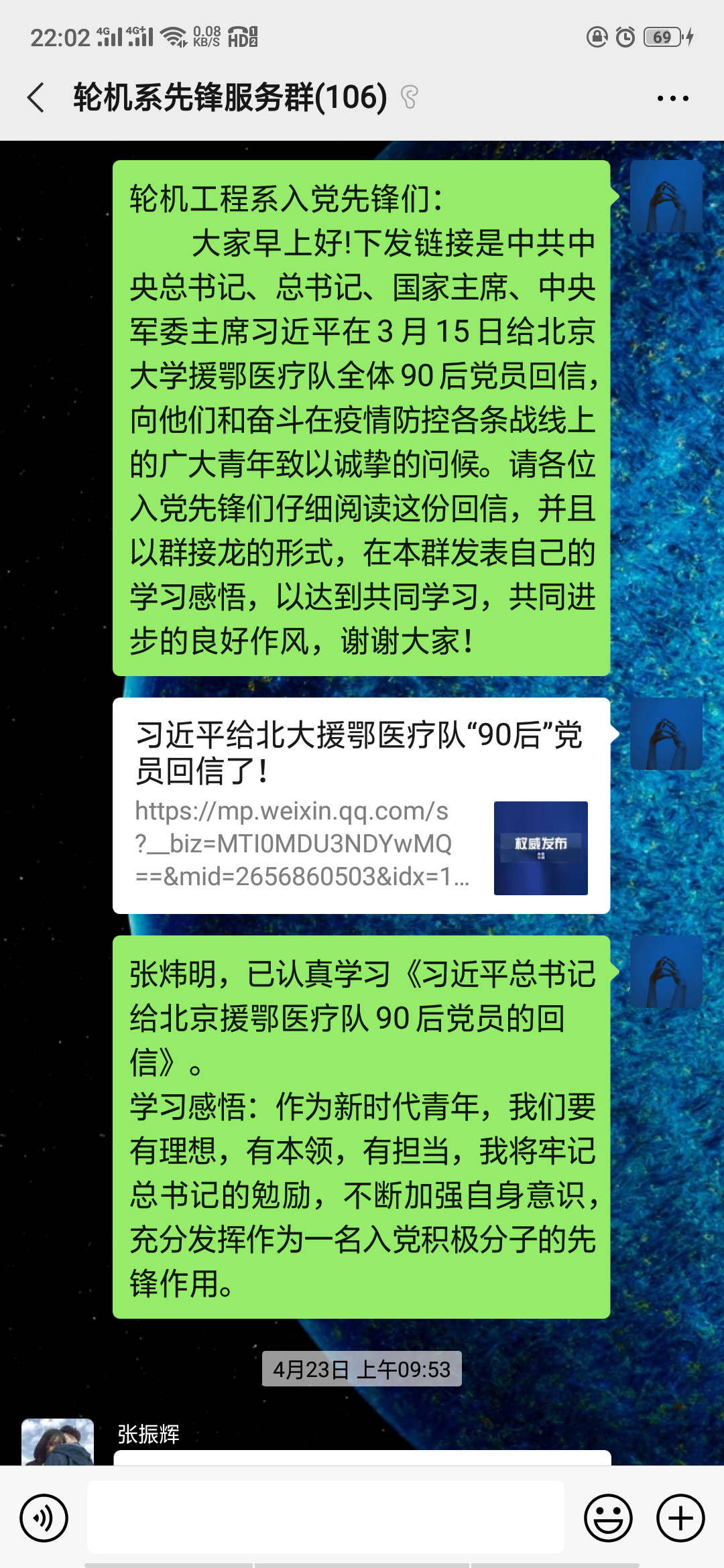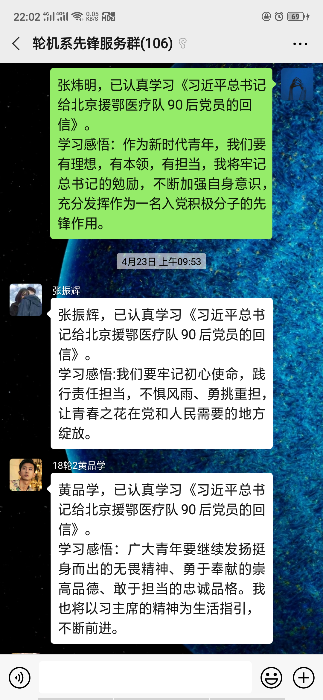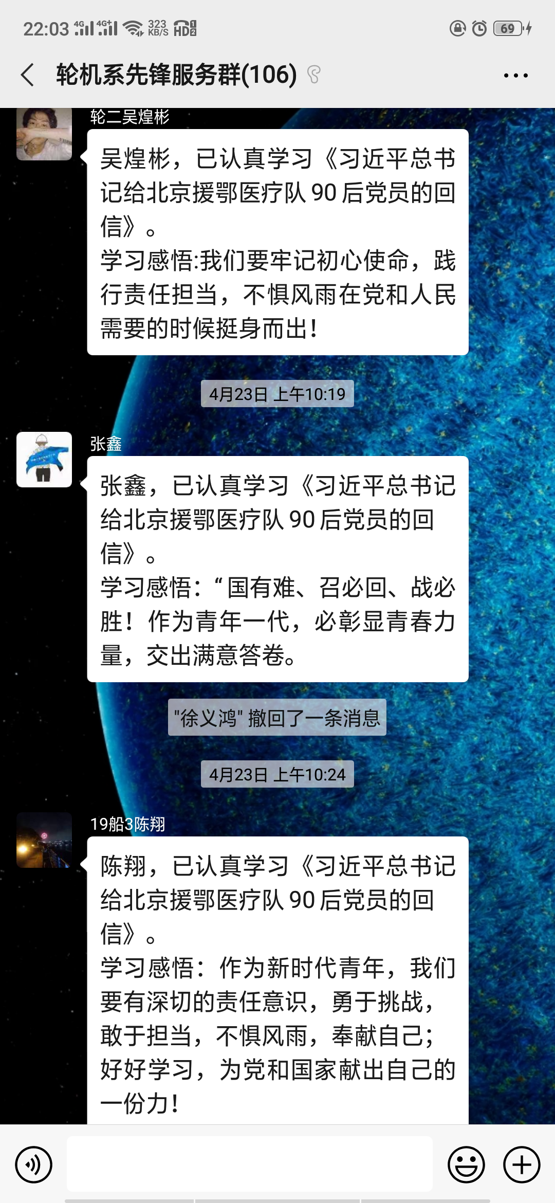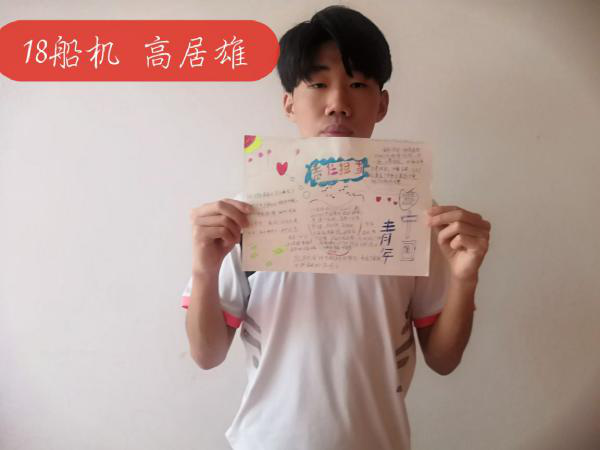 2017級(jí)輪機(jī)工程技術(shù)二班學(xué)生黨員陳濤說:在疫情面前,當(dāng)代青年“疫中有情,疫中見義”,這樣的使命和擔(dān)當(dāng),值得每一位青年學(xué)子思考與踐行。我們定要珍惜這個(gè)時(shí)代,擔(dān)負(fù)時(shí)代使命,在擔(dān)當(dāng)中歷練,在盡責(zé)中成長(zhǎng),當(dāng)祖國(guó)需要,當(dāng)人民需要,我們都將奮力向前,永不退縮,走好我們這一代人的長(zhǎng)征路。