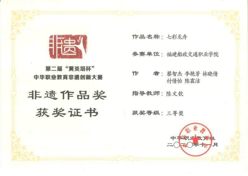 (4)成功復原趕繒船1:10模型-“清代戰(zhàn)船”、福州傳統(tǒng)龍舟1:10模型-“七彩龍舟”船模,并榮獲第二屆黃炎培杯中華職業(yè)教育非遺創(chuàng)新大賽《清代戰(zhàn)船》、《七彩龍舟》一等獎、三等獎;