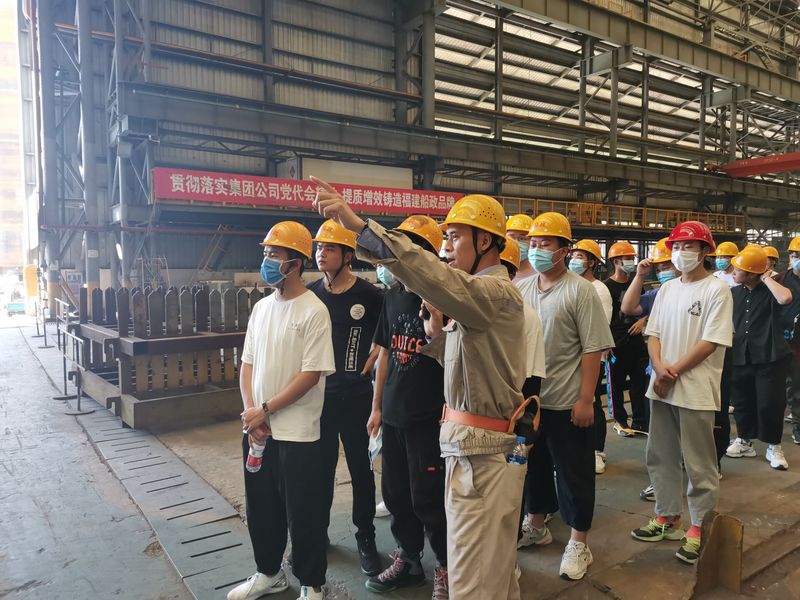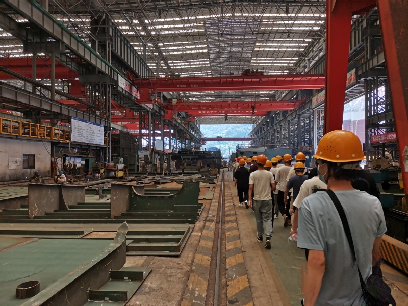 坐在車上從遠(yuǎn)處遙望就可以看見一座石像屹立在前方,那是馬尾造船廠創(chuàng)始人沈葆楨的石像。下了車,馬尾造船廠負(fù)責(zé)人熱情向我們走來,帶著講解員為在場學(xué)生們細(xì)細(xì)講述馬尾造船廠這155年來的建廠史,它濃縮了中國近代富國強兵的探索歷程。隨后,跟隨著講解員的步伐我們來到基地的設(shè)備制造廠,參觀最新的造船設(shè)備,感受精湛的造船工藝。最后,航海學(xué)院師生一行人來到碼頭,參觀造船工藝成果。
