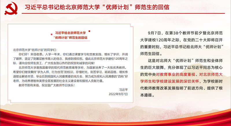 陳林泉老師:習近平總書記的回信,體現(xiàn)了以習近平同志為核心的黨中央對教育事業(yè)發(fā)展的高度重視,對北師大師生和學校建設(shè)發(fā)展的深切關(guān)懷。作為“四有”好老師的首倡地,北師大肩負著培養(yǎng)追夢人和筑夢人的雙重任務(wù),教育引導黨員同志廣大青年學子珍惜時光,刻苦學習,砥礪品格,傳承校訓精神,到祖國和人民最需要的地方去建功立業(yè)。