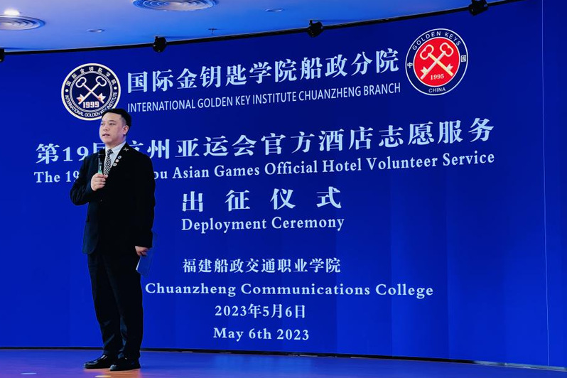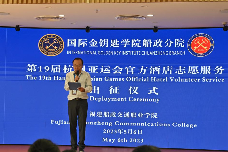 出征儀式首先由中國(guó)金鑰匙副秘書(shū)長(zhǎng)、國(guó)際金鑰匙學(xué)院(中國(guó)區(qū))運(yùn)營(yíng)官?gòu)堄孪壬x了國(guó)際金鑰匙學(xué)院船政分院第十九屆杭州亞運(yùn)會(huì)官方酒店志愿者錄用結(jié)果并致辭,他向志愿者代表們表示祝賀,他激勵(lì)同學(xué)們時(shí)刻秉承金鑰匙服務(wù)哲學(xué)全身心投入亞運(yùn)志愿活動(dòng)中。、