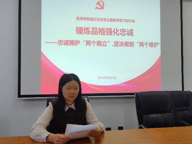 航海學(xué)院第五黨支部于2023年5月25日在校友樓307召開主題教育學(xué)習(xí),研討專題-錘煉品格強化忠誠—— 忠誠擁護(hù)“兩個確立”,堅決做到“兩個維護(hù)”,專題主要發(fā)言人為張秋霞老師。