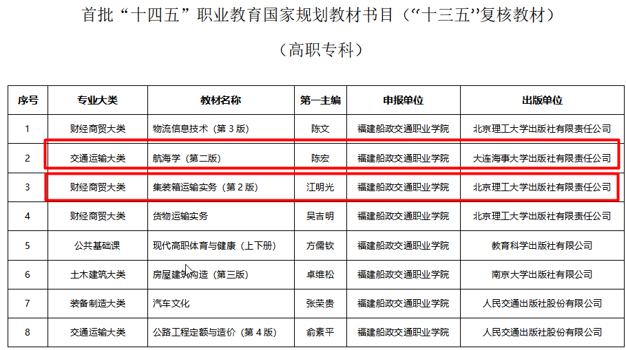 6月30日,教育部公布了首批“十四五”職業(yè)教育國(guó)家規(guī)劃教材書目,根據(jù)《“十四五”職業(yè)教育規(guī)劃教材建設(shè)實(shí)施方案》和《教育部辦公廳關(guān)于組織開展“十四五”首批職業(yè)教育國(guó)家規(guī)劃教材遴選工作的通知》要求,經(jīng)有關(guān)單位申報(bào)、形式審查、專家評(píng)審、專項(xiàng)審核、專家復(fù)核、面向社會(huì)公示等程序,共確定7251種教材入選首批“十四五”職業(yè)教育國(guó)家規(guī)劃教材(以下簡(jiǎn)稱“十四五”國(guó)規(guī)教材),涵蓋全部19個(gè)專業(yè)大類、1382個(gè)專業(yè)。航海技術(shù)專業(yè)群入選三本,其中新申報(bào)入選1本,“十三五”復(fù)核教材入選兩本。