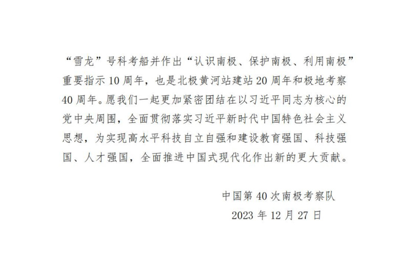 近日,遠(yuǎn)在南極執(zhí)行考察任務(wù)的中國第40次南極科學(xué)考察隊全體隊員向我院全體職工致以誠摯的節(jié)日問候,向我院對極地事業(yè)的長期支持和大力關(guān)心表示衷心的感謝。