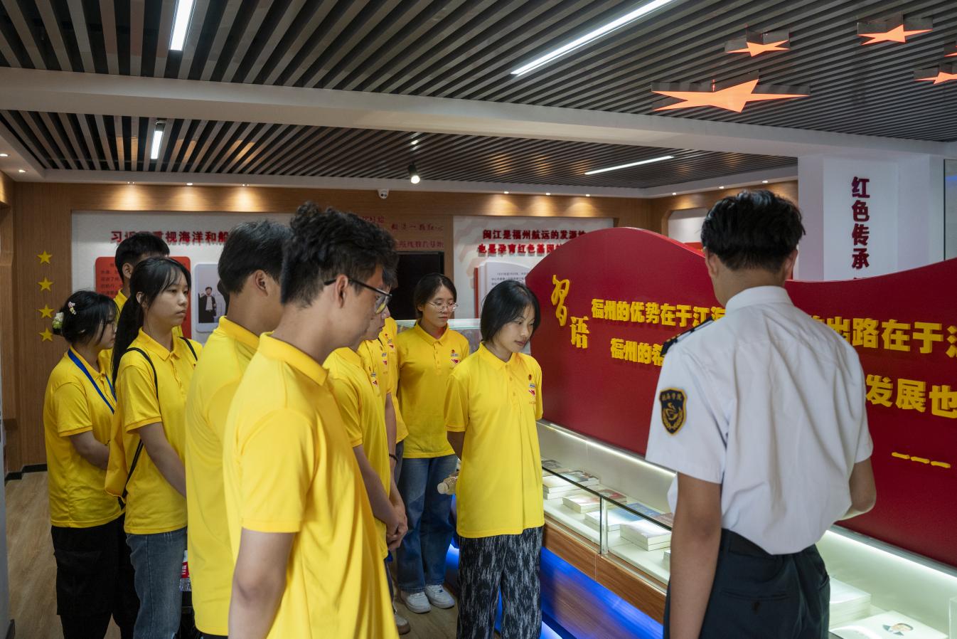館內(nèi)展示承載著閩江地下航線艱辛斗爭歷史記憶的老照片、珍貴的地下航線歷史文物,閩江流域的地下交通線斗爭歷史和水運歷史,講解員為同學們講述革命先輩的光榮歷史,帶領同學們追尋閩江之心的紅色史跡,進一步傳承和弘揚“閩江地下航線”紅色革命精神。