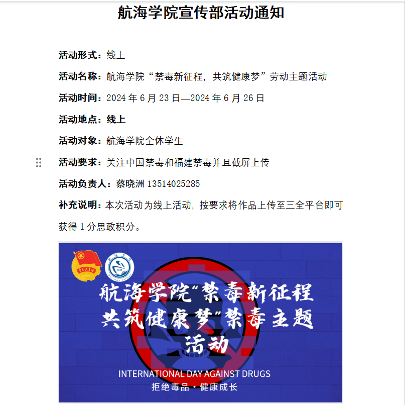 在2024年6月26日國際禁毒日來臨之際,為深入貫徹落實習(xí)近平總書記關(guān)于禁毒工作重要指示精神,全面有效開展2024年“全民禁毒宣傳月”活動,加強我院學(xué)生對毒品危害的認(rèn)識,增強自我保護(hù)意識,營造一個健康、和諧的校園環(huán)境,航海學(xué)院開展了一系列以“禁毒新征程,共筑健康夢”為主題的禁毒活動。