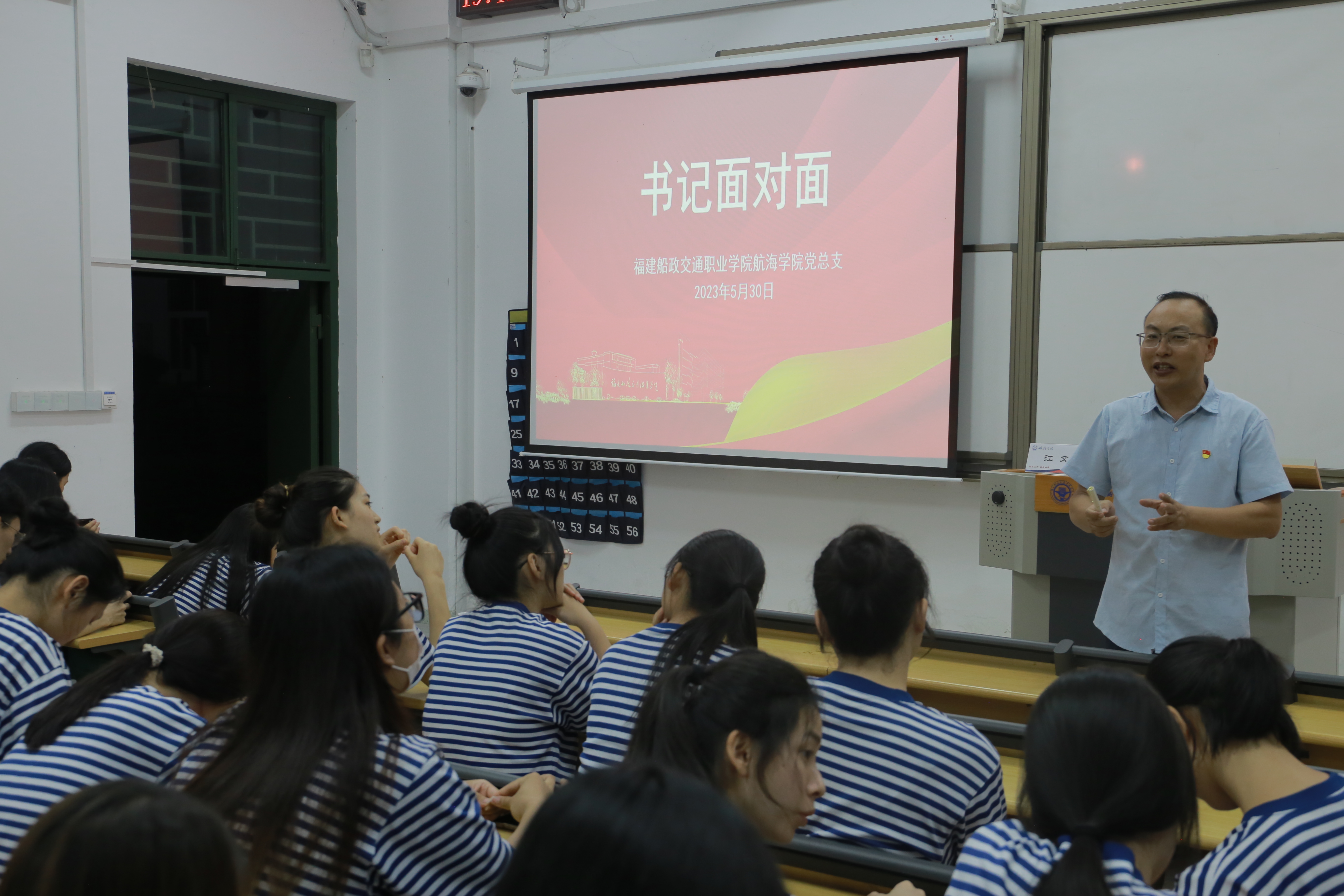 2023年5月30日19:00,2022級(jí)學(xué)生“書(shū)記面對(duì)面”在科技樓階梯教室開(kāi)展。航海學(xué)院師生代表100余名人參加該活動(dòng)。