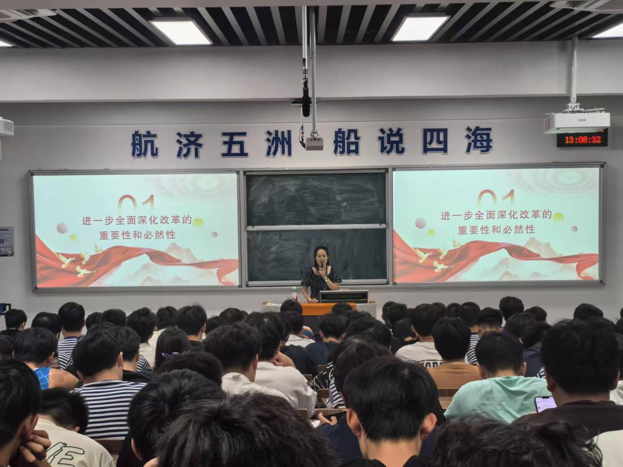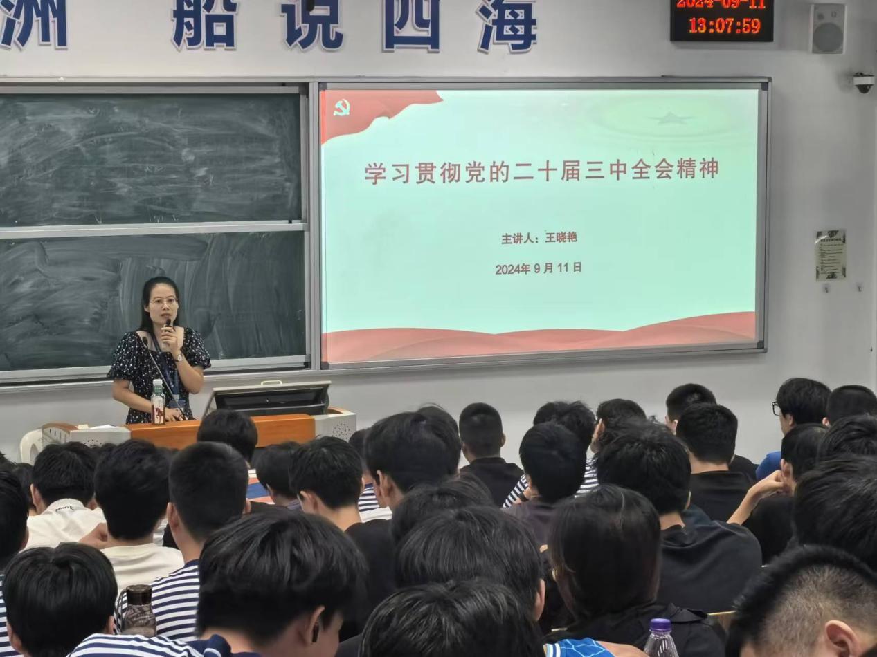 為深入學(xué)習(xí)黨的二十屆三中全會精神,激發(fā)廣大青年學(xué)生的愛國熱情與奮斗精神,9月11日,航海學(xué)院第一黨支部書記王曉艷老師在航東大教室開展了黨的二十屆三中全會精神的宣講活動,2022級航海技術(shù)、輪機工程技術(shù)專業(yè)學(xué)生代表共一百余人參加了講座。
