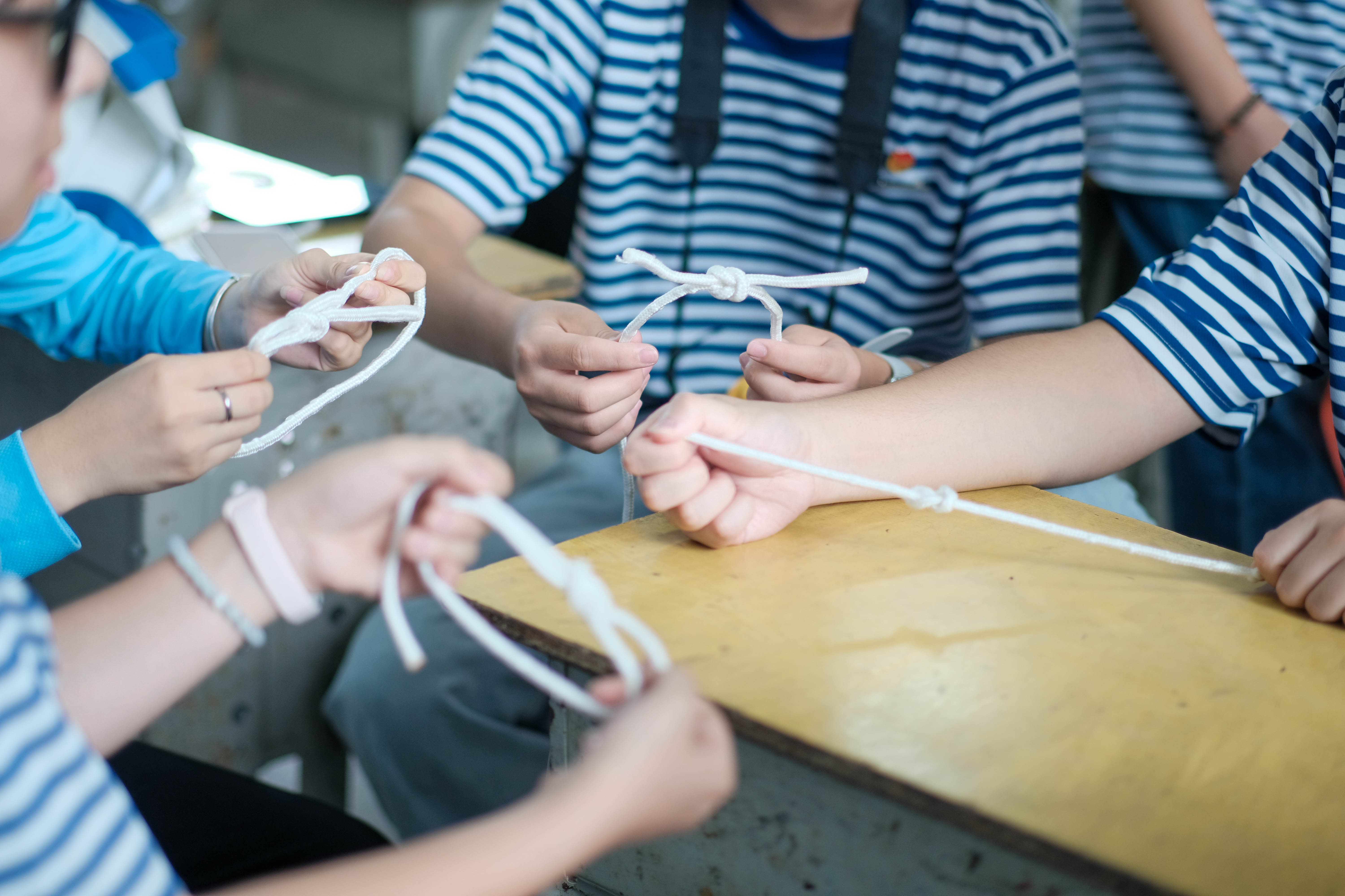 從最基礎(chǔ)的單結(jié)到航海必備的 “雙套結(jié)”,隊員們耐心講解每種繩結(jié)的用途:“漁民伯伯靠它固定漁網(wǎng),水手叔叔用它捆綁貨物,遇到危險時,它還能變成救生索呢!” 三年級的小宇舉著自己完成的 “八字結(jié)” 雀躍不已:“這個結(jié)像小蝴蝶,以后露營我要用來綁帳篷!” 三十雙小手翻飛,彩繩在課桌上編織出一個個迷你航海夢。