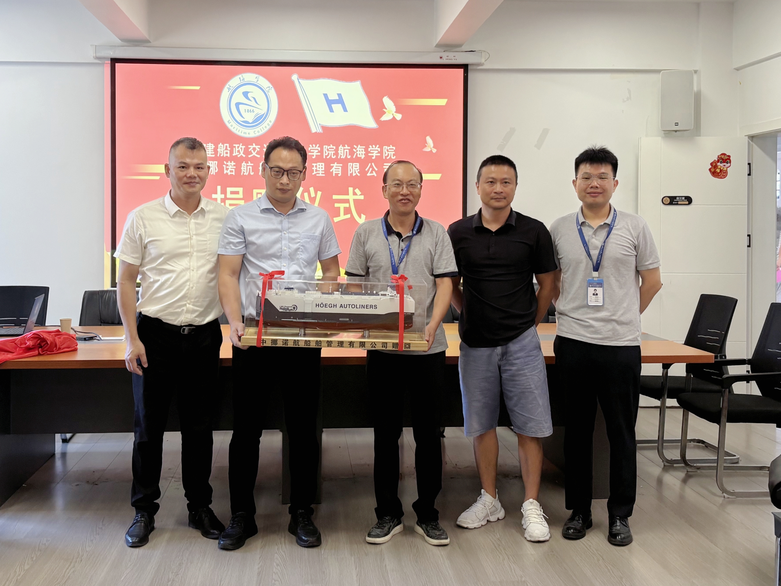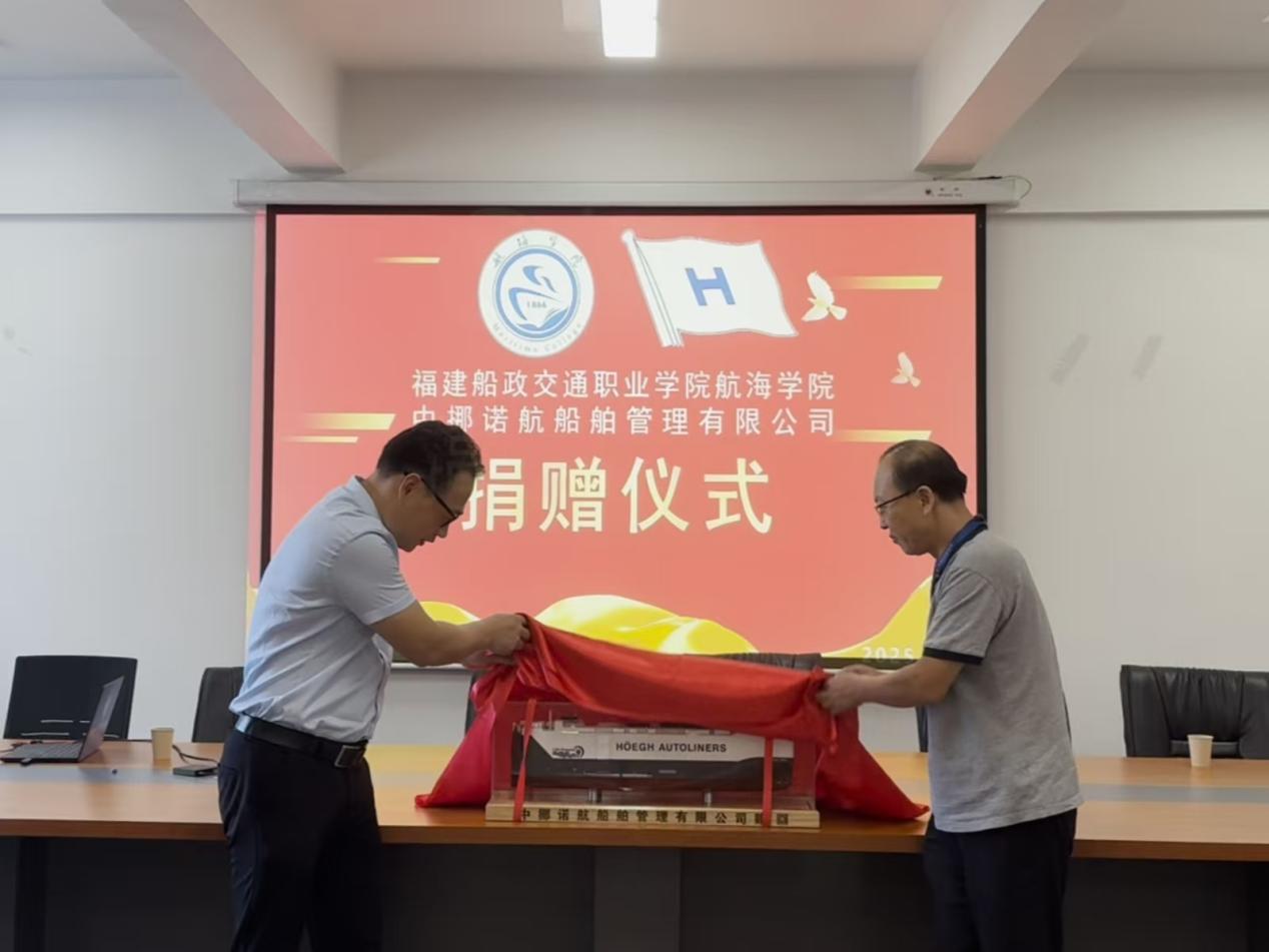 2025年9月11日,福建船政交通職業(yè)學(xué)院迎來了一份意義非凡的禮物——中挪諾航船舶管理有限公司專程向我院捐贈了一艘精美的中型滾裝船模型。捐贈儀式在校友之家307教室舉行,學(xué)院黨總支書記江文、企業(yè)代表與航海學(xué)院師生代表共同見證了這一重要時(shí)刻。