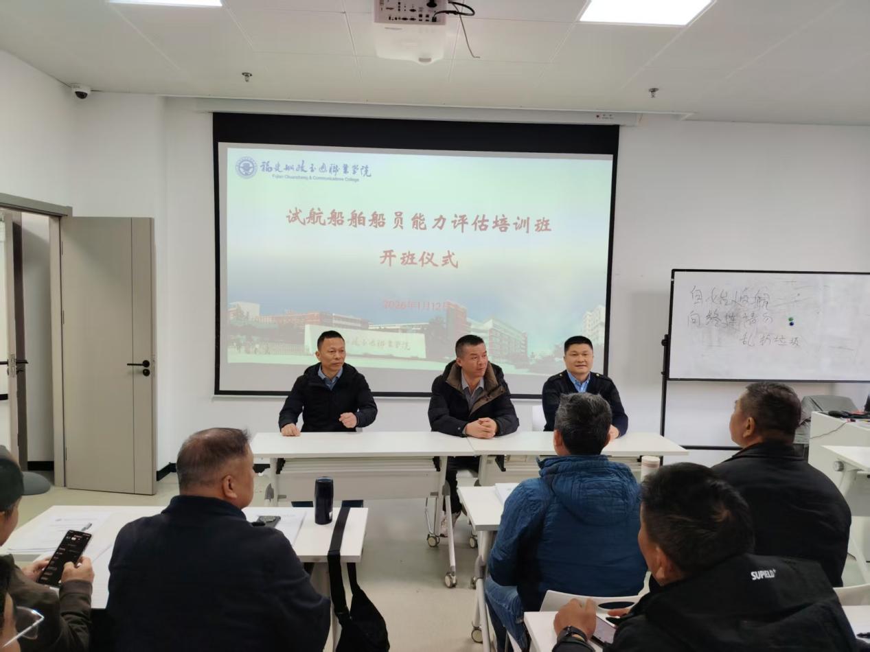 為推動福建轄區(qū)海船試航船員能力評估工作走向規(guī)范化、標(biāo)準(zhǔn)化,切實提升試航船舶航行安全水平,福建船政交通職業(yè)學(xué)院航海學(xué)院承辦籌備的首期“海船試航船舶船員能力評估培訓(xùn)班”,于2026年1月12日在福州正式開班。56名來自福州、寧德轄區(qū)航運一線的船長、大副、輪機(jī)長等骨干船員齊聚一堂,開啟專業(yè)淬煉之旅,福建首批“試航安全官”培育工作正式啟動。