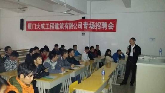 為進(jìn)一步做好我系2014屆畢業(yè)生就業(yè)工作,為畢業(yè)生求職和用人單位招聘人才搭建平臺(tái)、提供更好的服務(wù),我系于2013年12月10日下午2:30到5:30在信息系2-1教室召開了廈門大成工程建設(shè)有限公司專場(chǎng)招聘會(huì)。