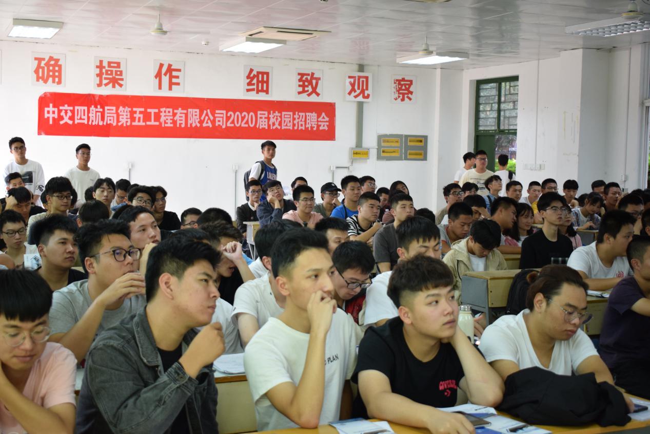 2019年10月16日下午,中交四航局第五工程有限公司校園專場招聘會在高蓋山校區(qū)科技路102教室順利舉辦,公司林經理以及200余名道工系應屆畢業(yè)生參加了此次招聘會。