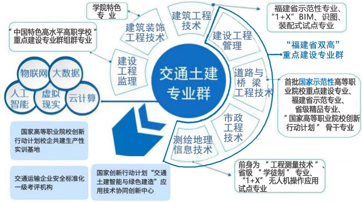 目前,土木工程學院招生的專業(yè)有道路與橋梁工程技術、市政工程技術、建設工程監(jiān)理、測繪與地理信息技術、建筑工程技術、建設工程管理、建筑裝飾工程技術等7個專業(yè)。其中,道路與橋梁工程技術是首批國家示范性高等職業(yè)院校建設計劃中央財政重點支持建設的專業(yè)(簡稱“國家示范校重點專業(yè)”)、國家創(chuàng)新發(fā)展行動計劃骨干專業(yè)、福建省示范專業(yè)、福建省精品專業(yè),“福建省雙高”重點建設專業(yè)群的核心專業(yè),2017年通過IEET國際認證;建設工程監(jiān)理專業(yè)是“中國特色高水平高職學校與高水平專業(yè)建設計劃”(簡稱“國家雙高”)高水平專業(yè)群的組群專業(yè);市政工程技術、測繪與地理信息技術、建設工程管理專業(yè)是“福建省雙高”重點建設專業(yè)群(道路與橋梁工程技術專業(yè)群)的組群專業(yè);建筑工程技術是福建省示范專業(yè);建筑裝飾工程技術專業(yè)為學校特色專業(yè)。