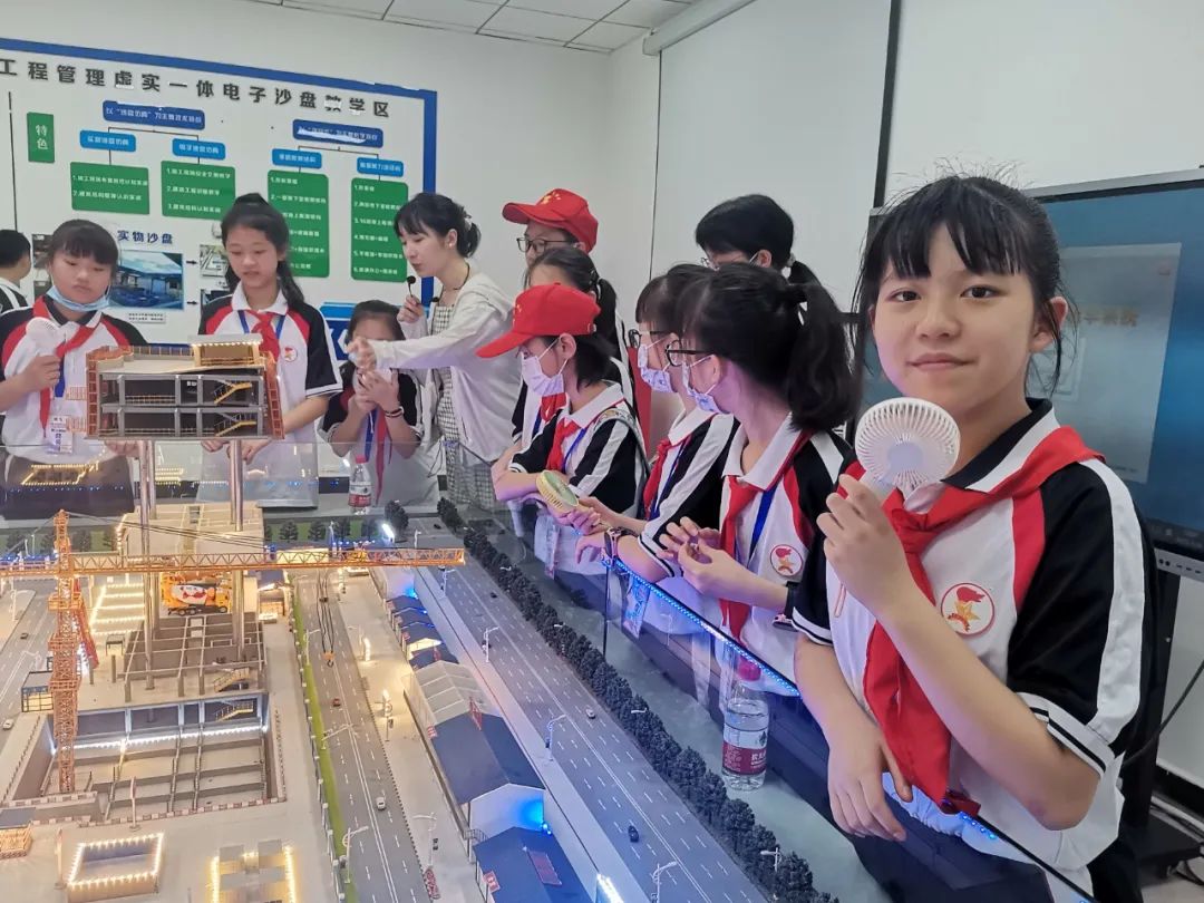 由實訓指導老師帶領少先隊們先后參觀了智慧檢測基地、建設工程虛實結合實景教學實訓室。通過現(xiàn)場實景模型觀摩體驗,少先隊們了解了建筑構造以及橋梁、隧道的組成,對建筑模型產生濃厚的興趣,對未來職業(yè)發(fā)展充滿期待與向往。