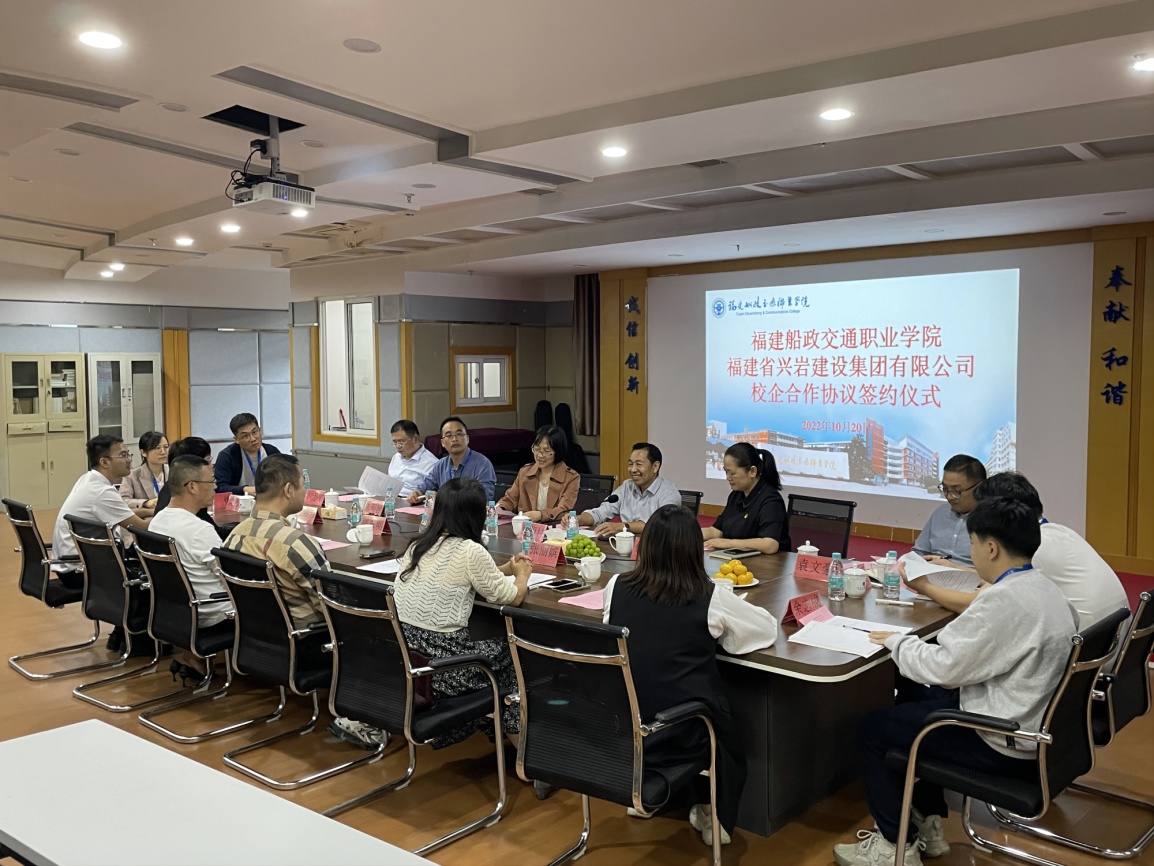 2022年10月20日下午,為了深入推進產(chǎn)教融合、校企合作,提升人才培養(yǎng)質(zhì)量,福建船政交通職業(yè)學院與福建省興巖建設(shè)集團有限公司舉行校企合作協(xié)議簽訂并授牌儀式。本次簽約授牌儀式在創(chuàng)新樓1007舉行,出席的企業(yè)代表有總經(jīng)理葉永斌、副總經(jīng)理張麗嬪、總工程師鄭東明等其他企業(yè)部門負責人,校方代表有張祖柱副院長,土木工程學院黨政領(lǐng)導及專業(yè)帶頭人。