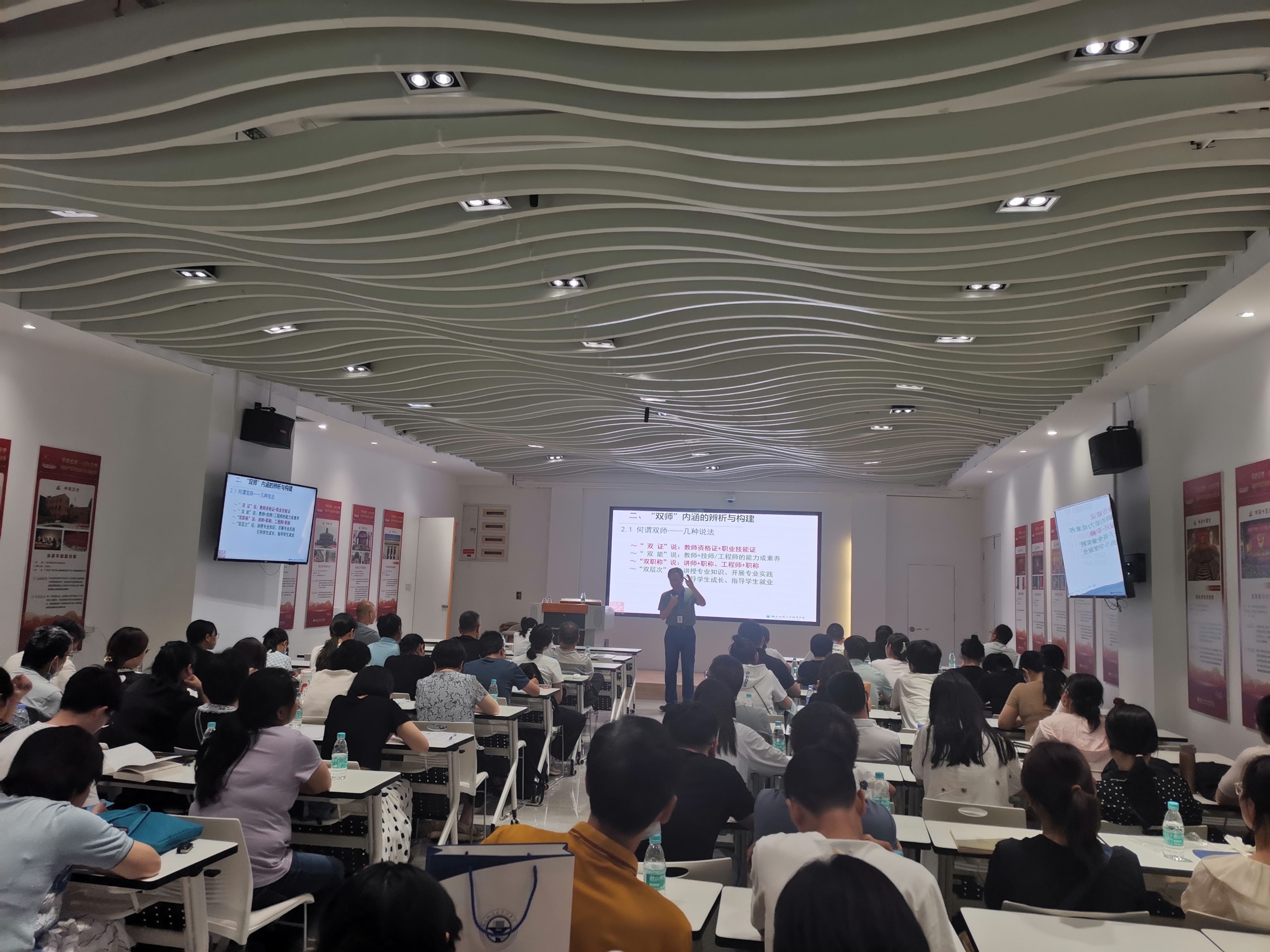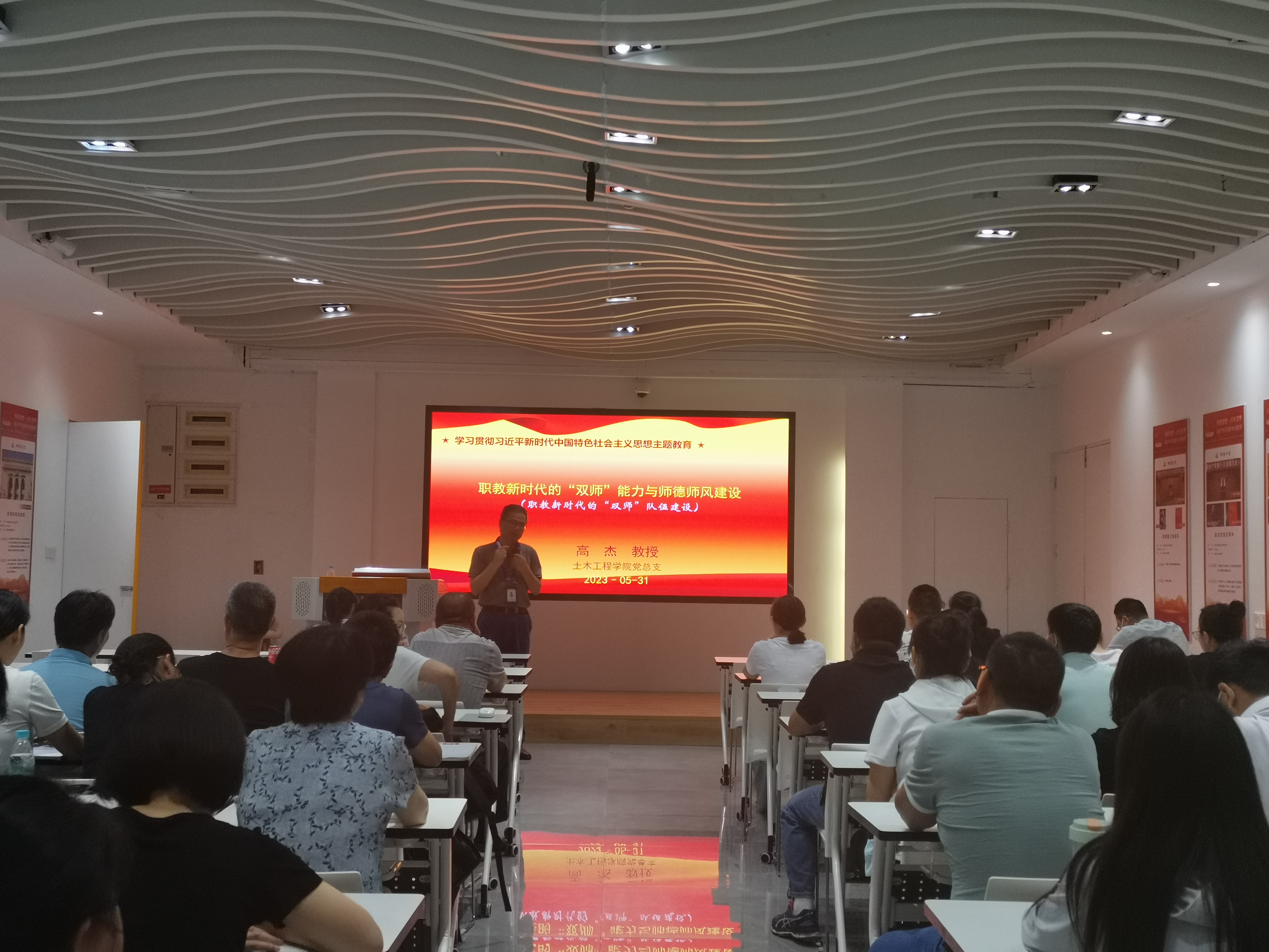 為全面貫徹黨的二十大精神,深入開展學習貫徹習近平新時代中國特色社會主義思想主題教育,實施“深學爭優(yōu)、敢為爭先、實干爭效”行動,5月31日下午,土木工程學院黨總支書記高杰同志在鑒知樓三樓黨建暨船政文化研究研學中心以《職教新時代的“雙師”能力與師德師風建設》為題,上主題教育專題黨課并作同題學術講座,土木工程學院領導班子成員、副科級以上干部、黨員教師等參加。
