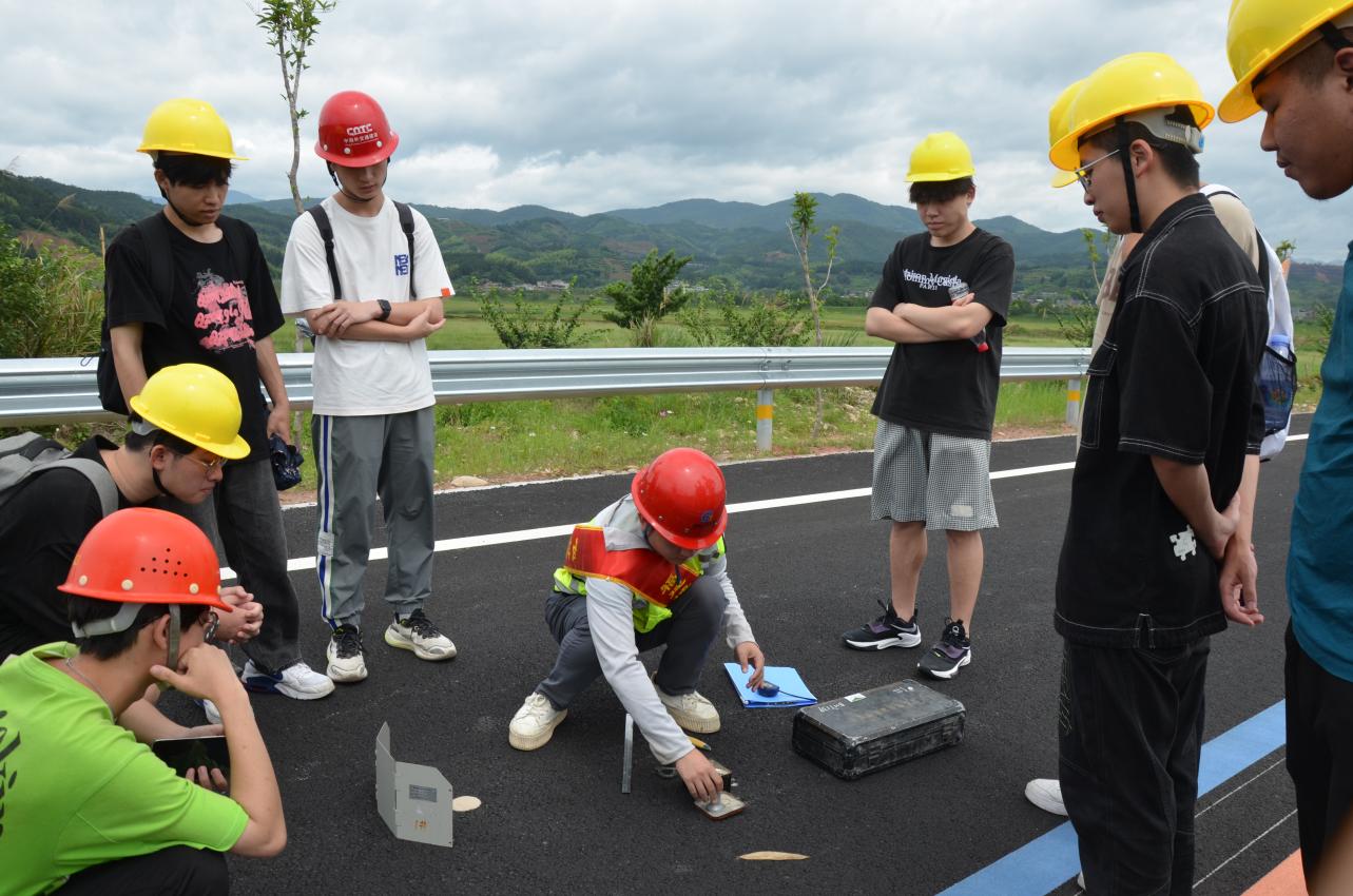 在檢測(cè)行業(yè)專(zhuān)家和黨員教師的指導(dǎo)下,21道路與橋梁工程技術(shù)專(zhuān)業(yè)學(xué)生踴躍參與并依次完成了瀝青路面及其交通安全附屬設(shè)施現(xiàn)場(chǎng)檢測(cè)。瀝青路面現(xiàn)場(chǎng)檢測(cè)參數(shù)包括路面的壓實(shí)度、厚度、構(gòu)造深度、摩擦系數(shù),交通安全附屬設(shè)施現(xiàn)場(chǎng)檢測(cè)參數(shù)包括標(biāo)志標(biāo)線逆反射系數(shù)、標(biāo)線厚度、標(biāo)志基礎(chǔ)尺寸、立柱埋深及涂層厚度等?;顒?dòng)中,專(zhuān)家們還向?qū)W生們?cè)敿?xì)講解了瀝青路面施工質(zhì)量動(dòng)態(tài)管理過(guò)程中質(zhì)量檢測(cè)內(nèi)容及技術(shù)標(biāo)準(zhǔn),并根據(jù)《公路瀝青路面施工技術(shù)規(guī)范》《公路工程質(zhì)量檢驗(yàn)評(píng)定標(biāo)準(zhǔn)》,指導(dǎo)學(xué)生分析現(xiàn)場(chǎng)檢測(cè)數(shù)據(jù)、評(píng)定路面施工質(zhì)量。