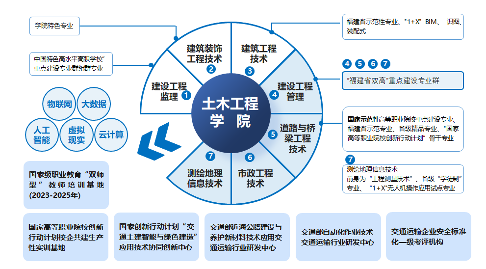 土木工程學(xué)院是全省培養(yǎng)交通工程建設(shè)與管理高素質(zhì)技術(shù)技能人才的重要基地。目前擁有國(guó)家級(jí)交通土建智能與綠色建造應(yīng)用技術(shù)協(xié)同創(chuàng)新中心、國(guó)家級(jí)職業(yè)教育“雙師型”教師培訓(xùn)基地、國(guó)家高等職業(yè)院校創(chuàng)新行動(dòng)計(jì)劃校企共建生產(chǎn)性實(shí)訓(xùn)基地、交通部自動(dòng)化作業(yè)技術(shù)交通運(yùn)輸行業(yè)研發(fā)中心,交通部近海公路建設(shè)與養(yǎng)護(hù)新材料技術(shù)應(yīng)用交通運(yùn)輸行業(yè)研發(fā)中心,獲交通運(yùn)輸企業(yè)安全生產(chǎn)標(biāo)準(zhǔn)化一級(jí)評(píng)價(jià)機(jī)構(gòu)資質(zhì)。實(shí)踐教學(xué)條件處于國(guó)內(nèi)同類院校同類專業(yè)領(lǐng)先水平。現(xiàn)有在校生3500余人,自1974年開辦以來,已為全國(guó)和福建交通建設(shè)培養(yǎng)了近2萬(wàn)名交通土建類相關(guān)專業(yè)畢業(yè)生。