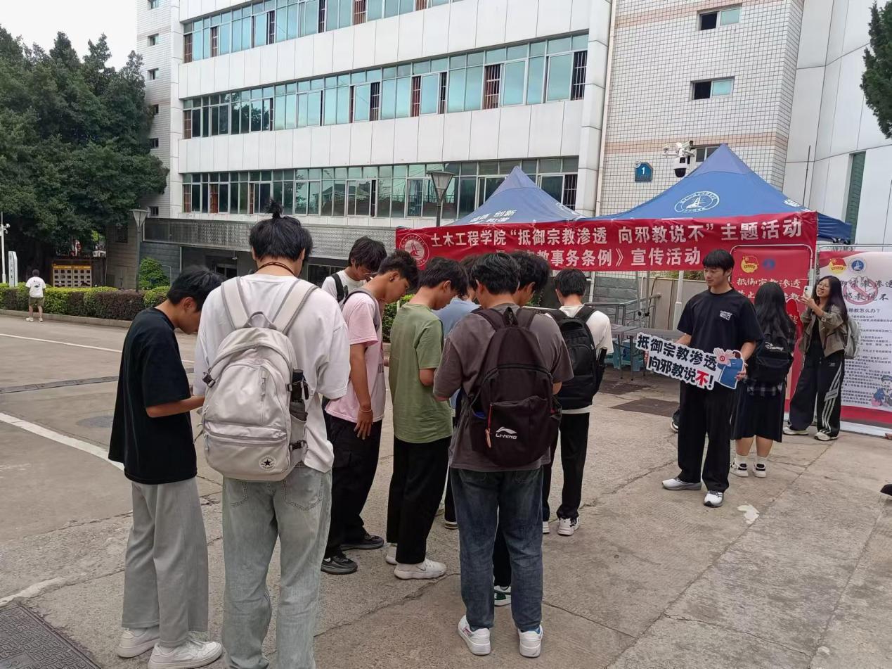 為大力弘揚法治正能量,增強學(xué)生反邪教意識,切實筑牢防范遏制邪教滲透的思想防線,全力維護平安和諧的校園環(huán)境。2024年10月23日,土木工程學(xué)院于福航園“一站式”學(xué)生社區(qū)開展“抵御宗教滲透,向邪教說不”主題活動暨《宗教事務(wù)條例》宣傳活動。